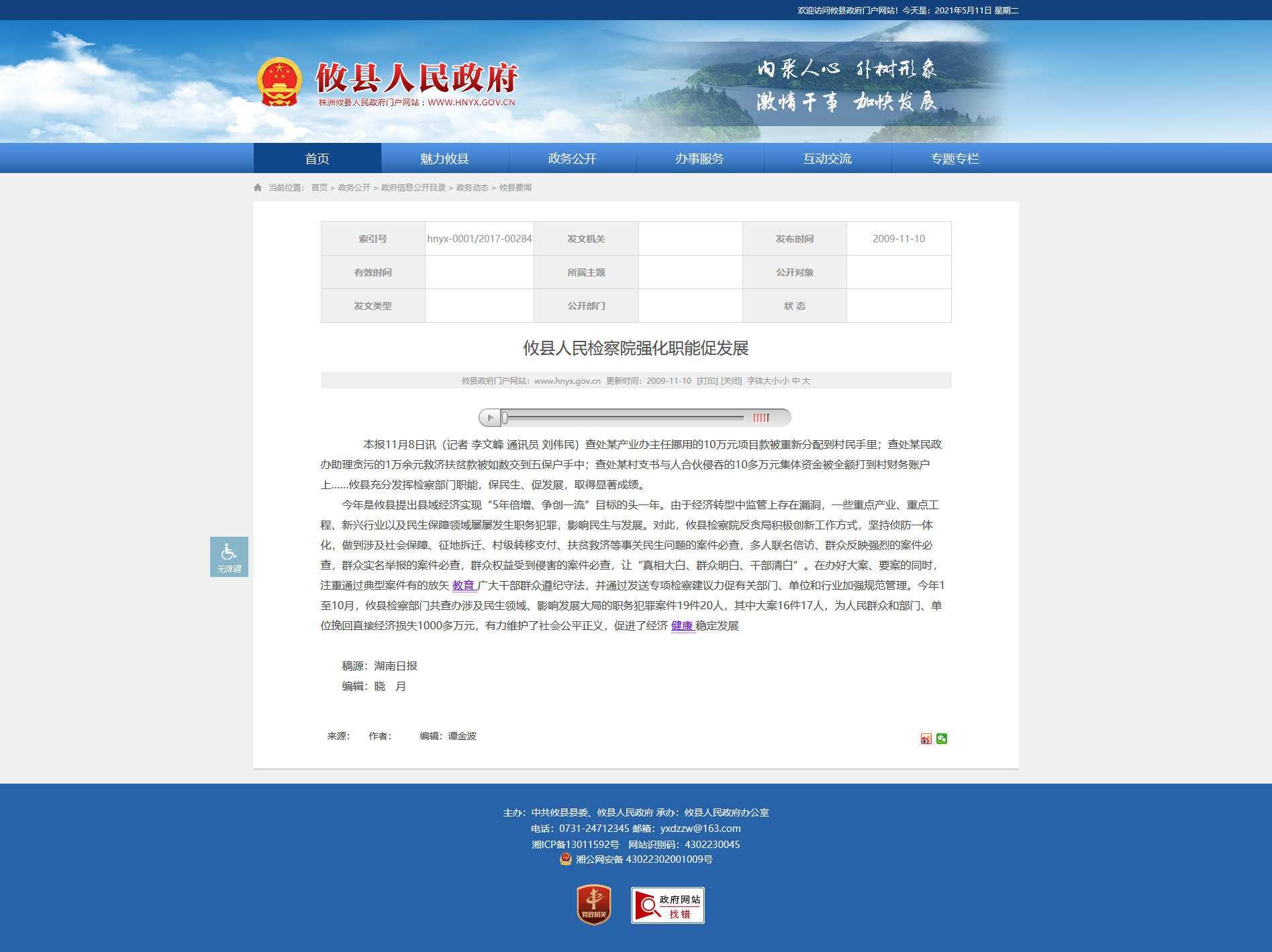 本报11月8日讯(记者 李文峰 通讯员 刘伟民)查处某产业办主任挪用的10万元项目款被重新分配到村民手里;查处某民政办助理贪污的1万余元救济扶贫款被如数交到五保户手中;查处某村支书与人合伙侵吞的10多万元集体资金被全额打到村财务账户上……攸县充分发挥检察部门职能,保民生、促发展,取得显著成绩。