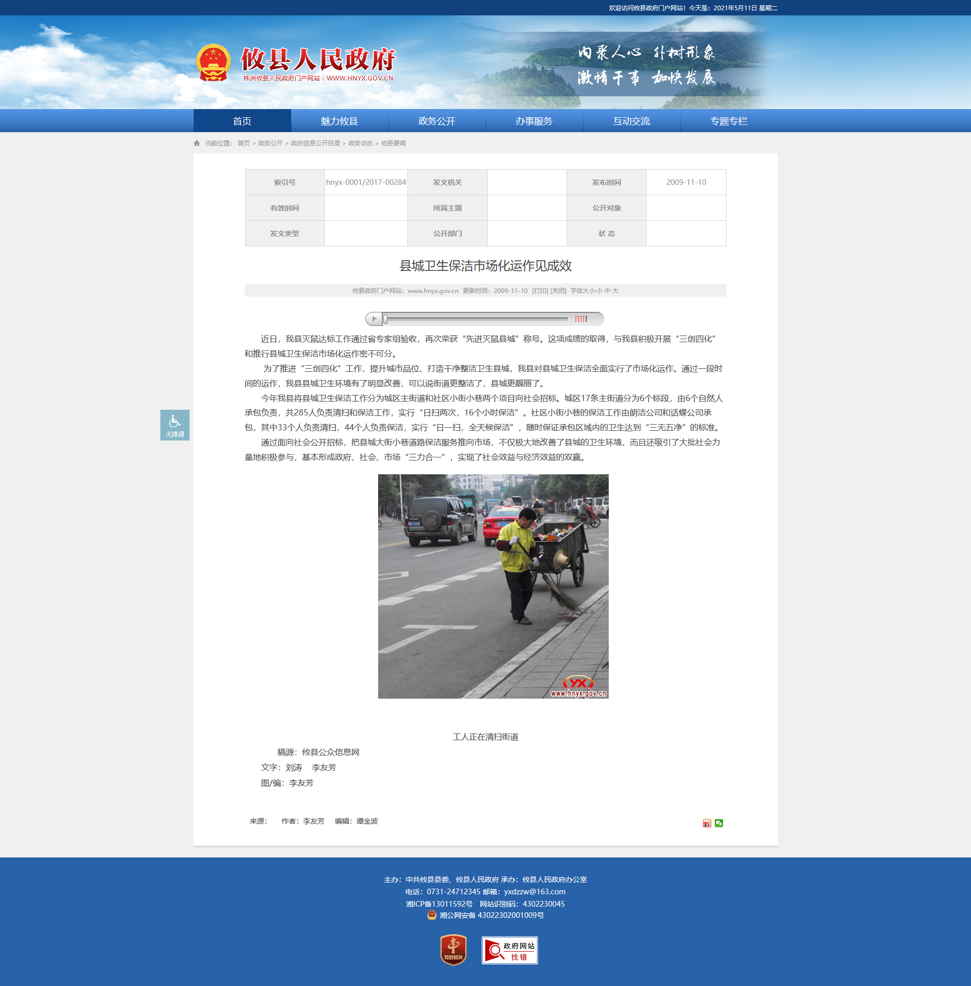 近日,我县灭鼠达标工作通过省专家组验收,再次荣获“先进灭鼠县城”称号。这项成绩的取得,与我县积极开展“三创四化”和推行县城卫生保洁市场化运作密不可分。 为了推进“三创四化”工作,提升城市品位、打造干净整洁卫生县城,我县对县城卫生保洁全面实行了市场化运作。通过一段时间的运作,我县县城卫生环境有了明显改善,可以说街道更整洁了,县城更靓丽了。 今年我县将县城卫生保洁工作分为城区主街道和社区小街小巷两个项目向社会招标。城区17条主街道分为6个标段,由6个自然人承包负责,共285人负责清扫和保洁工作,实行“日扫两次,16个小时保洁”。社区小街小巷的保洁工作由朗洁公司和话蝶公司承包,其中33个人负责清扫,44个人负责保洁,实行“日一扫,全天候保洁”,随时保证承包区域内的卫生达到“三无五净”的标准。 通过面向社会公开招标,把县城大街小巷道路保洁服务推向市场,不仅极大地改善了县城的卫生环境,而且还吸引了大批社会力量地积极参与,基本形成政府、社会、市场“三力合一”,实现了社会效益与经济效益的双赢。
