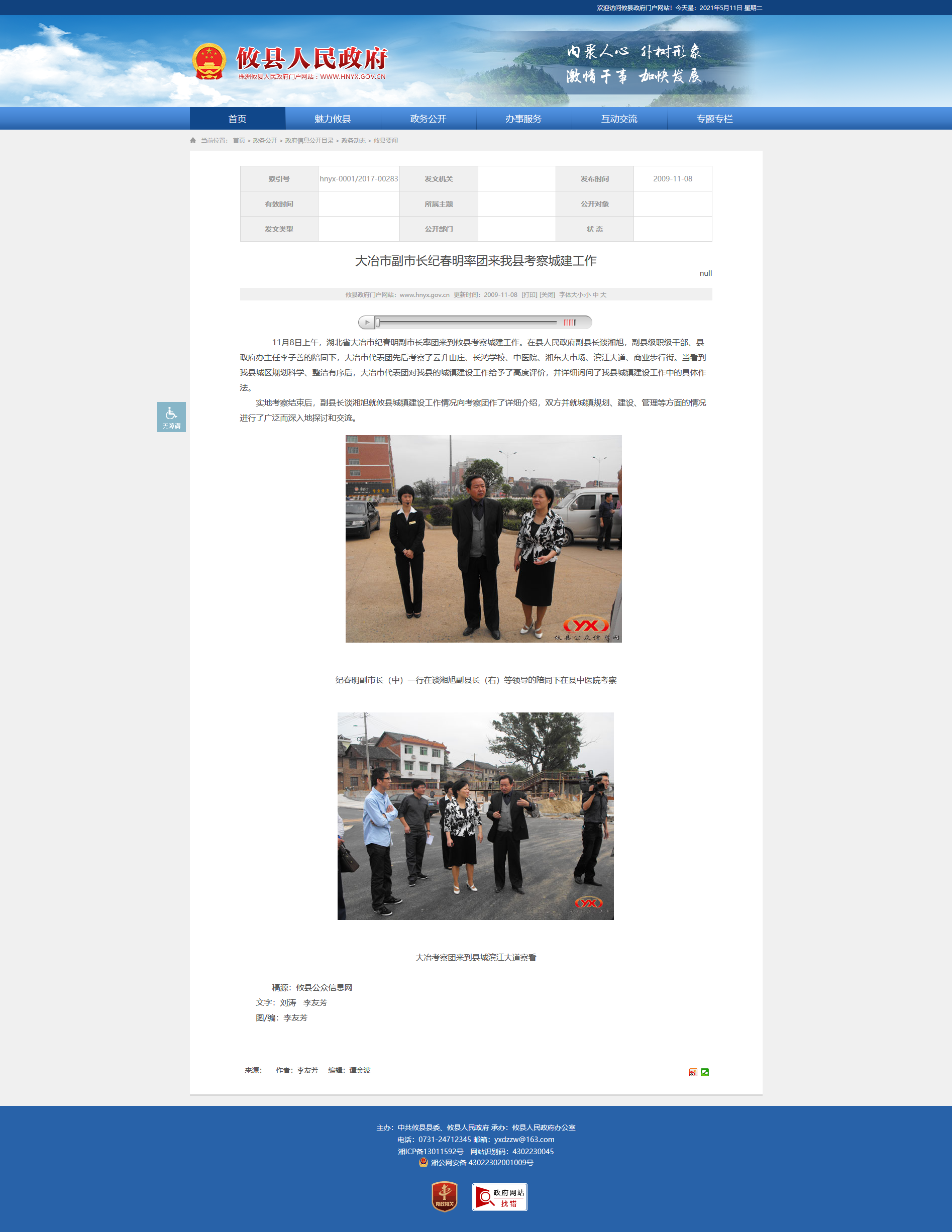 11月8日上午,湖北省大冶市纪春明副市长率团来到攸县考察城建工作。在县人民政府副县长谈湘旭,副县级职级干部、县政府办主任李子善的陪同下,大冶市代表团先后考察了云升山庄、长鸿学校、中医院、湘东大市场、滨江大道、商业步行街。当看到我县城区规划科学、整洁有序后,大冶市代表团对我县的城镇建设工作给予了高度评价,并详细询问了我县城镇建设工作中的具体作法。