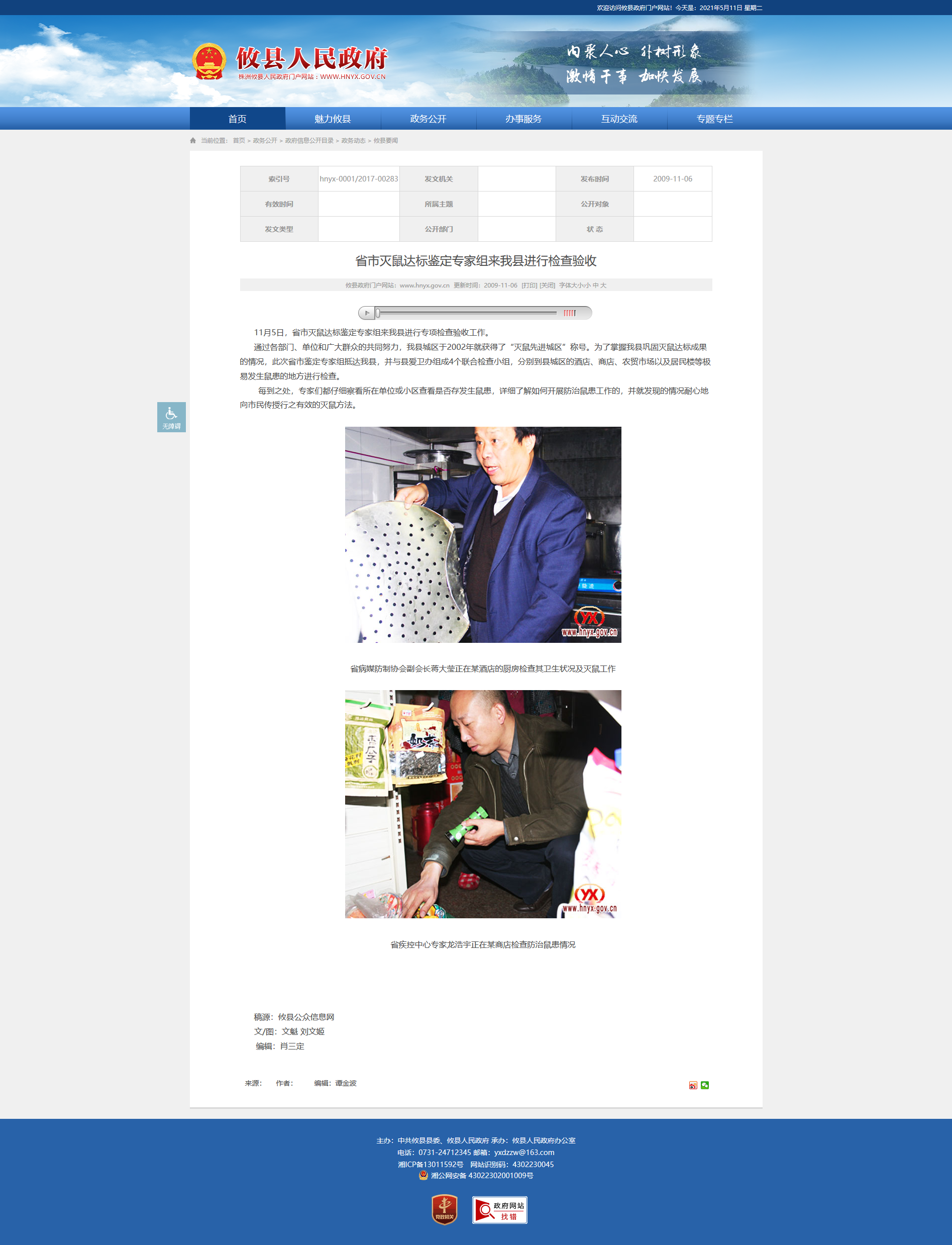 11月5日,省市灭鼠达标鉴定专家组来我县进行专项检查验收工作。 通过各部门、单位和广大群众的共同努力,我县城区于2002年就获得了“灭鼠先进城区”称号。为了掌握我县巩固灭鼠达标成果的情况,此次省市鉴定专家组抵达我县,并与县爱卫办组成4个联合检查小组,分别到县城区的酒店、商店、农贸市场以及居民楼等极易发生鼠患的地方进行检查。