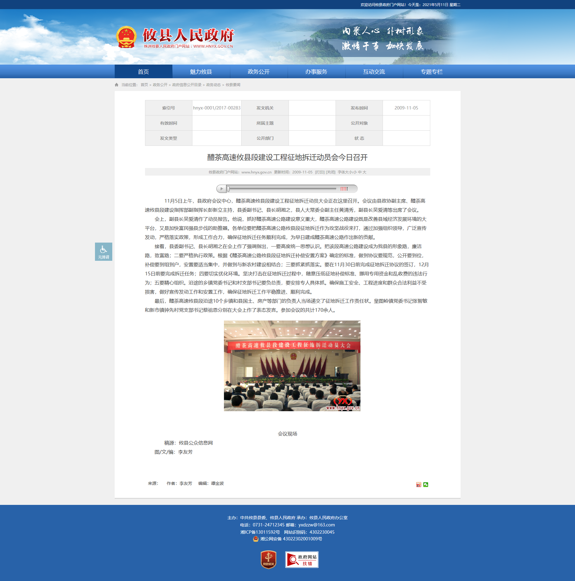 接着,县委副书记、县长胡湘之在会上作了强调指出,一要高度统一思想认识。把该段高速公路建设成为我县的形象路,廉洁路,致富路;二要严格执行政策。根据《醴茶高速公路攸县段征地拆迁补偿安置方案》确定的标准,做到协议要规范,公开要到位,补偿要到组到户,安置要适当集中,并做到与新农村建设相结合;三要抓紧抓落实。要在11月30日前完成征地拆迁协议的签订,12月15日前要完成拆迁任务;四要切实优化环境。坚决打击在征地拆迁过程中,随意压低征地补偿标准、挪用专用资金和乱收费的违法行为;五要精心组织。沿途的乡镇党委书记和村支部书记要负总责,要安排专人具体抓。确保施工安全、工程进度和群众合法利益不受损害,做好宣传发动工作和安置工作,确保征地拆迁工作平稳推进、顺利完成。