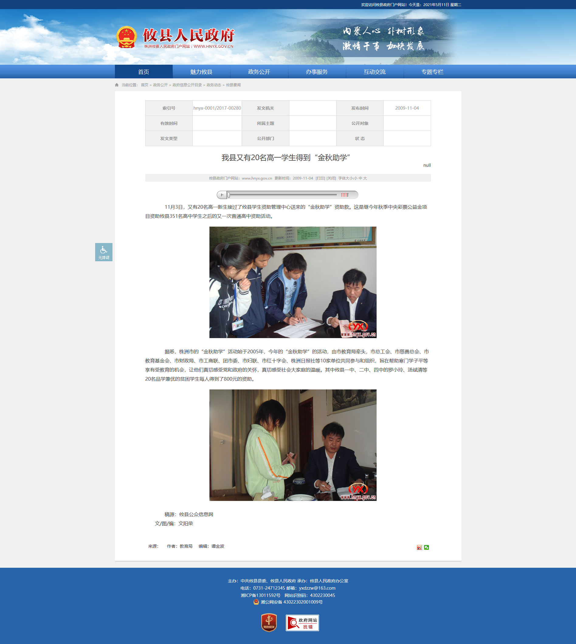 11月3日,又有20名高一新生接过了攸县学生资助管理中心送来的“金秋助学”资助款。这是继今年秋季中央彩票公益金项目资助攸县351名高中学生之后的又一次普通高中资助活动。