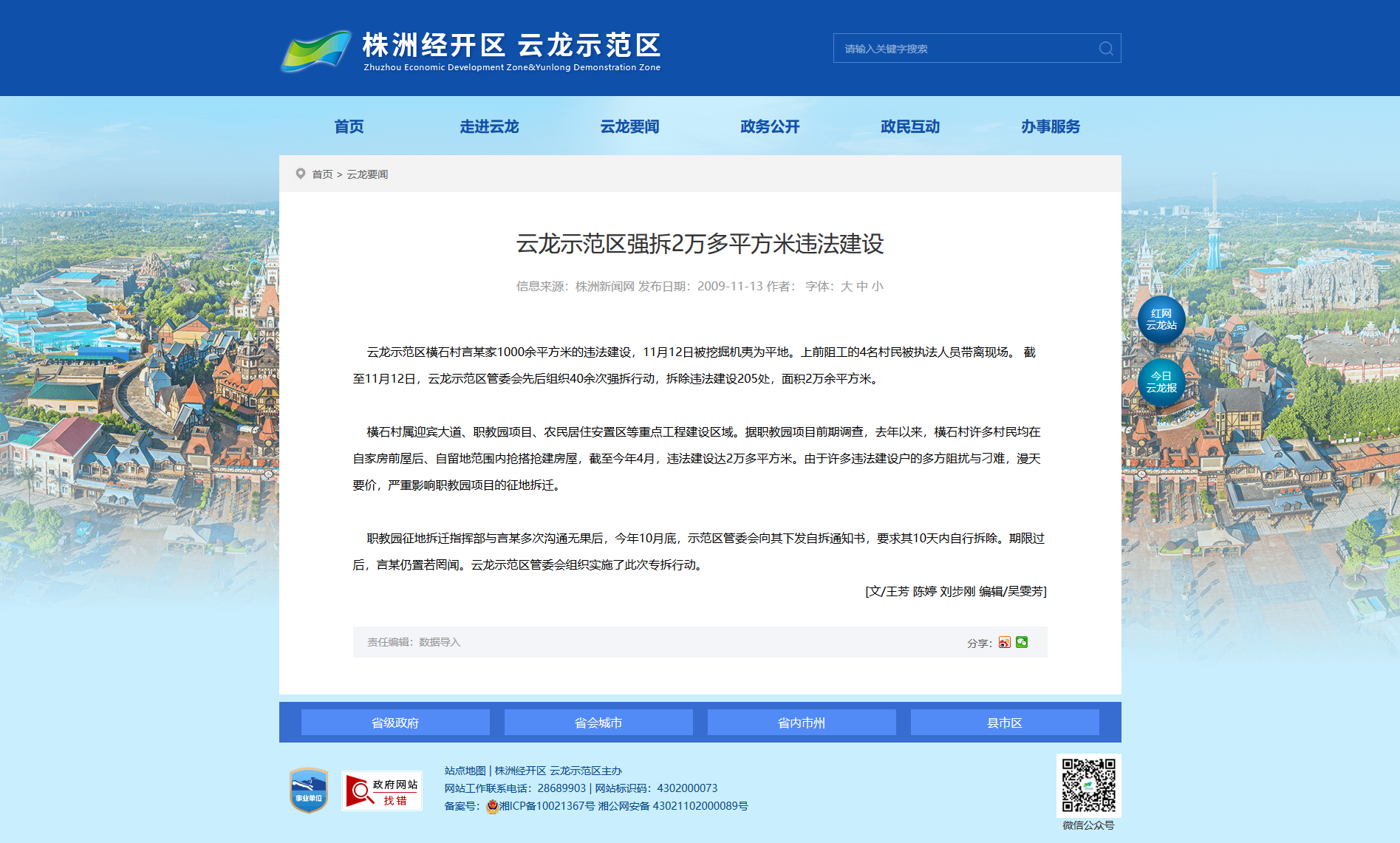 云龙示范区横石村言某家1000余平方米的违法建设,11月12日被挖掘机夷为平地。上前阻工的4名村民被执法人员带离现场。 截至11月12日,云龙示范区管委会先后组织40余次强拆行动,拆除违法建设205处,面积2万余平方米。