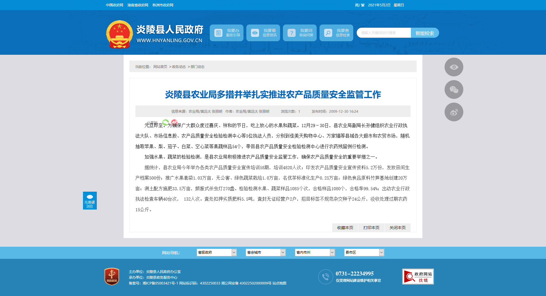 据统计,县农业局今年举办各类农产品质量安全宣传培训58期,培训4820人次;印发农产品质量安全宣传资料5.2万份,发放田间生产档案500份;推广水果套袋1.03万亩,无公害、绿色蔬菜栽培1.0万亩,名优茶标准化生产0.25万亩;绿色食品原料竹笋基地创建20万亩;测土配方施肥33.5万亩,频振式杀虫灯270盏。检验检测水果、蔬菜样品1085个次,合格样品1080个,合格率99.54%;出动农业行政执法检查车辆40台次, 132人次。査处扣押劣质肥料5.5吨,査封无证经营户2户,招回标签不规范杂交种子24公斤,没收处理过期农药15公斤。