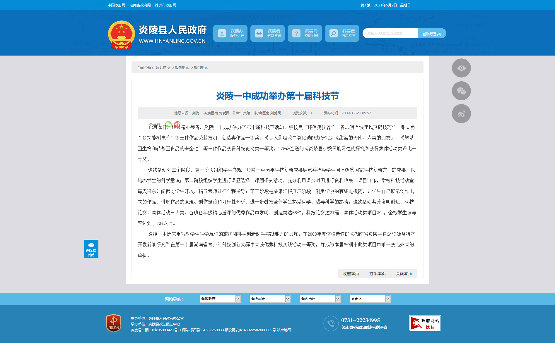 这次活动分三个阶段,第一阶段组织学生参观了炎陵一中历年科技创新成果展览并指导学生网上浏览国家科技创新方面的成果,以培养学生的科学意识;第二阶段组织学生进行课题选择,课题研究活动,充分利用课余时间进行资料收集,项目制作,学校科技活动室每天课余时间都对学生开放,指导老师进行全程指导;第三阶段是成果汇报展示阶段,利用学校的有线电视网,让学生自己展示创作出来的作品,讲解作品的原理、创作思路和可行性分析,进一步激发全体学生热爱科学、倡导科学的热情。这次活动共分发明创造、科技论文、集体活动三大类,各班各年级精心送评的优秀作品中发明、创造类达68件,科技论文达21篇,集体活动类项目2个,全校学生参与率达到了80%以上。