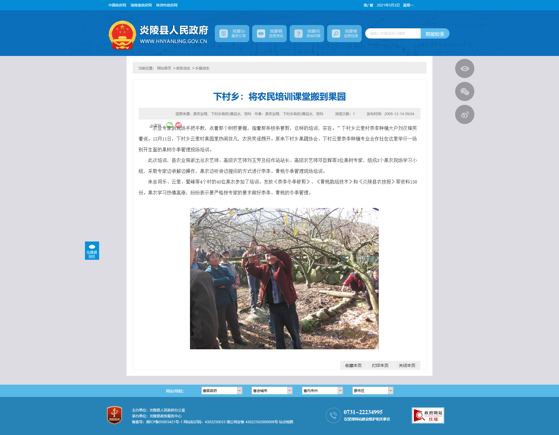 来自同乐、云里、鹫峰等4个村的45位果农参加了培训。发放《柰李冬季修剪》、《黄桃栽培技术》和《炎陵县农技报》等资料150份。果农学习热情高涨,纷纷表示要严格按专家的要求做好柰李、黄桃的冬季管理。