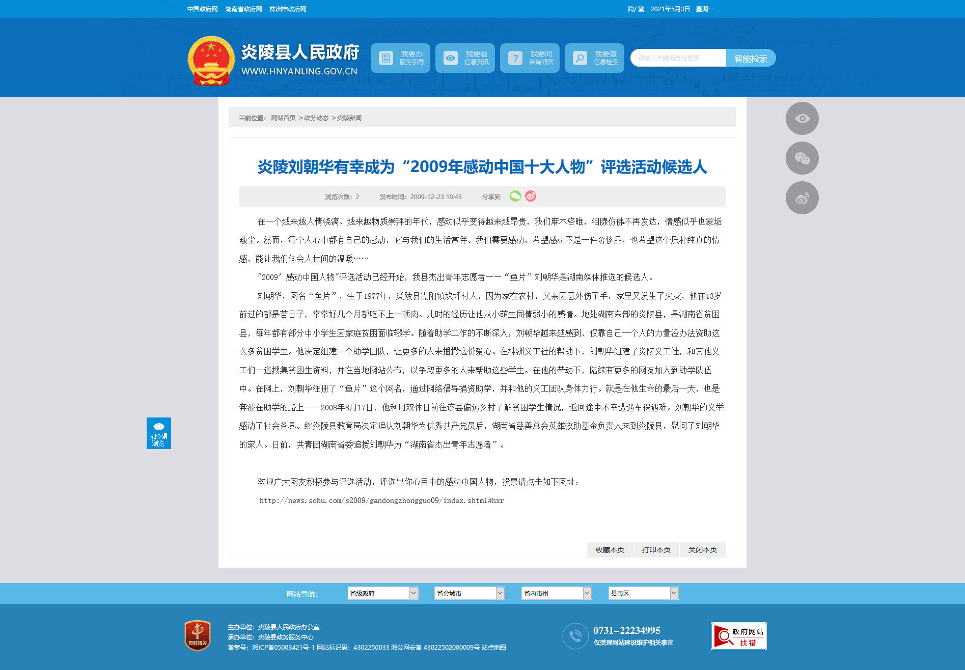 刘朝华,网名“鱼片”,生于1977年,炎陵县霞阳镇坎坪村人,因为家在农村,父亲因意外伤了手,家里又发生了火灾,他在13岁前过的都是苦日子,常常好几个月都吃不上一顿肉。儿时的经历让他从小萌生同情弱小的感情。地处湖南东部的炎陵县,是湖南省贫困县,每年都有部分中小学生因家庭贫困面临辍学。随着助学工作的不断深入,刘朝华越来越感到,仅靠自己一个人的力量没办法资助这么多贫困学生。他决定组建一个助学团队,让更多的人来播撒这份爱心。在株洲义工社的帮助下,刘朝华组建了炎陵义工社,和其他义工们一道搜集贫困生资料,并在当地网站公布,以争取更多的人来帮助这些学生。在他的带动下,陆续有更多的网友加入到助学队伍中。在网上,刘朝华注册了“鱼片”这个网名,通过网络倡导捐资助学,并和他的义工团队身体力行。就是在他生命的最后一天,也是奔波在助学的路上——