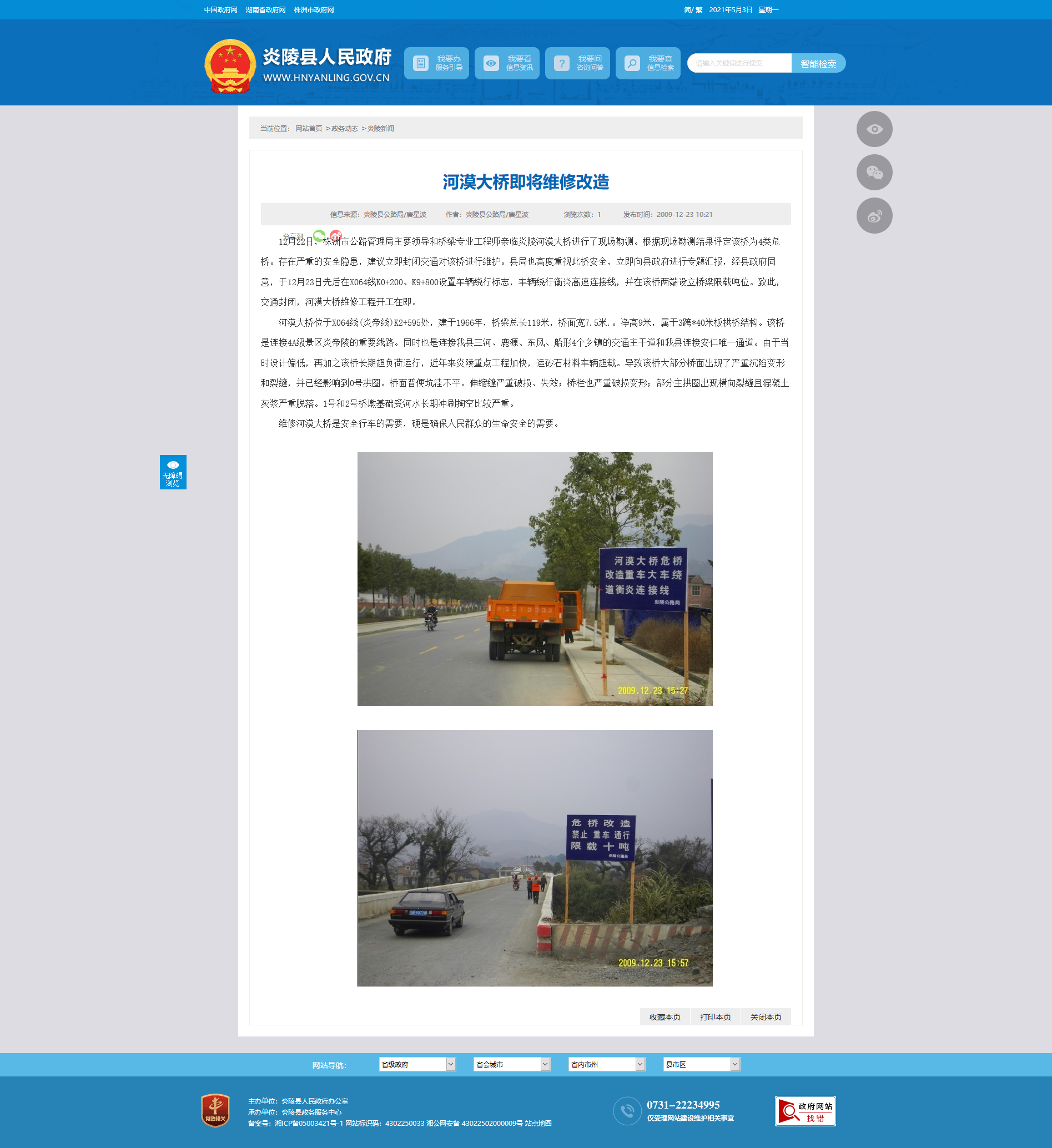 12月22日,株洲市公路管理局主要领导和桥梁专业工程师亲临炎陵河漠大桥进行了现场勘测。根据现场勘测结果评定该桥为4类危桥。存在严重的安全隐患,建议立即封闭交通对该桥进行维护。县局也高度重视此桥安全,立即向县政府进行专题汇报,经县政府同意,于12月23日先后在X064线K0 200、K9 800设置车辆绕行标志,车辆绕行衡炎高速连接线,并在该桥两端设立桥梁限载吨位。致此,交通封闭,河漠大桥维修工程开工在即。