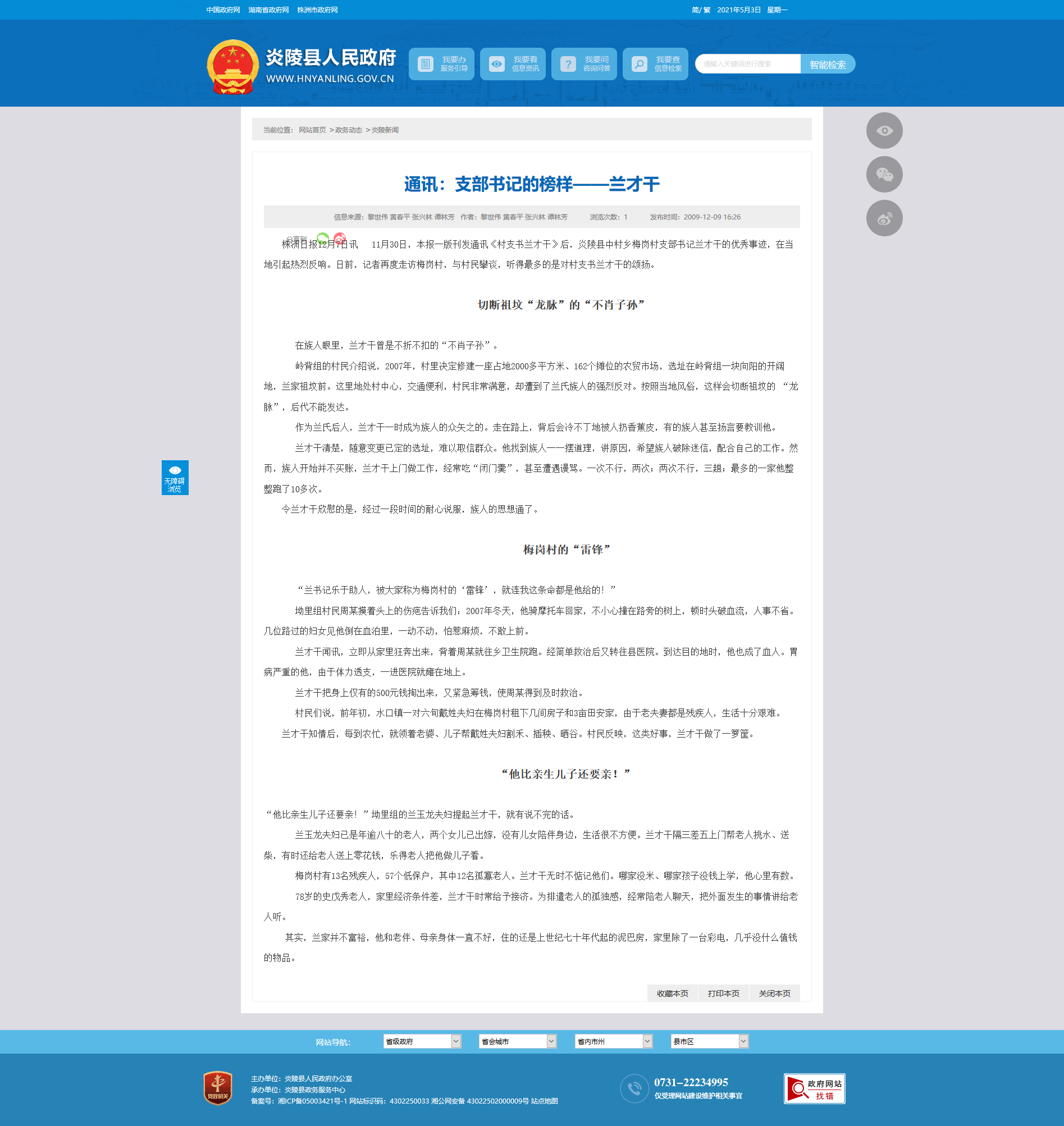 “兰书记乐于助人,被大家称为梅岗村的‘雷锋’,就连我这条命都是他给的!”