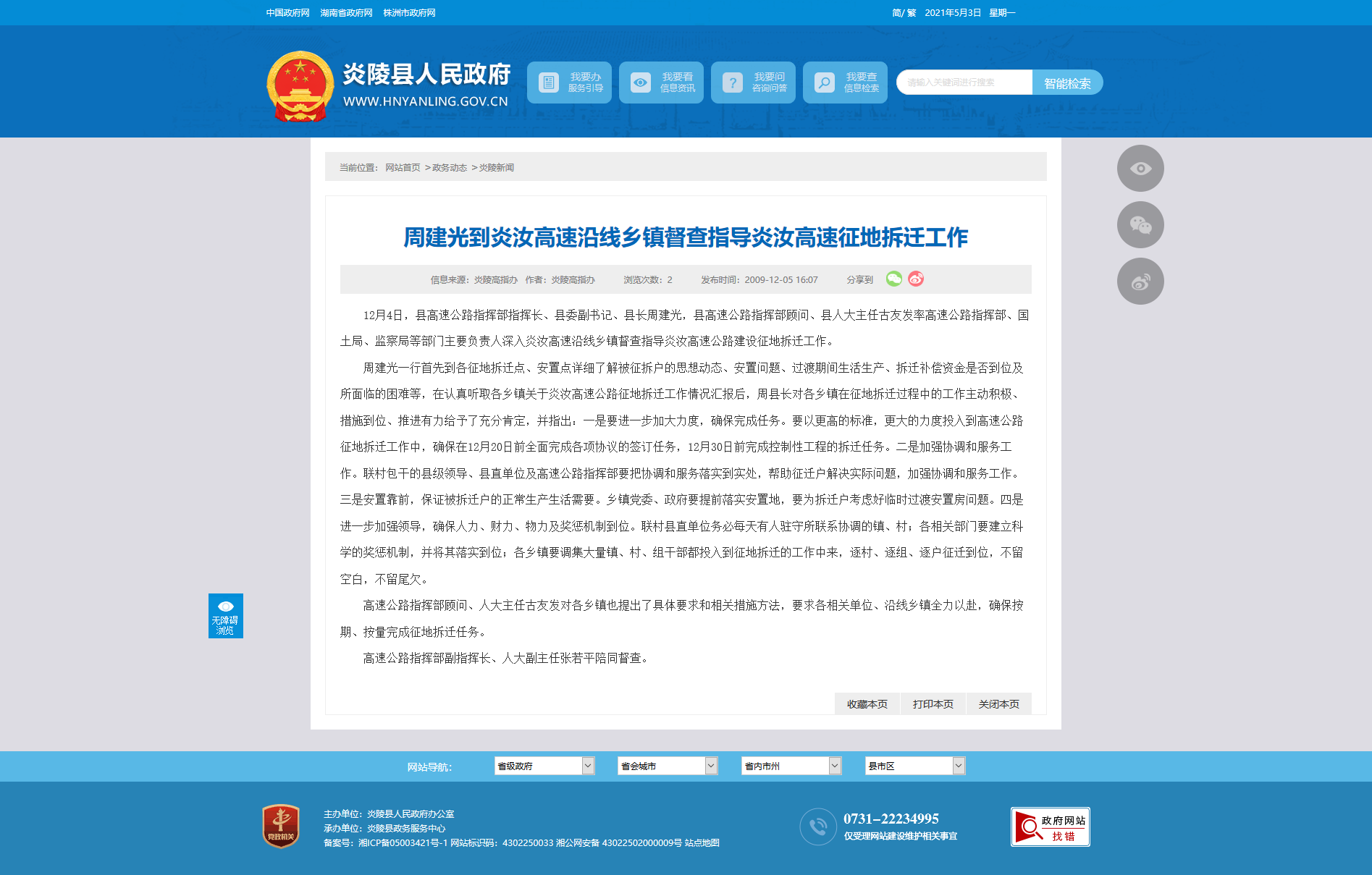 12月4日,县高速公路指挥部指挥长、县委副书记、县长周建光,县高速公路指挥部顾问、县人大主任古友发率高速公路指挥部、国土局、监察局等部门主要负责人深入炎汝高速沿线乡镇督查指导炎汝高速公路建设征地拆迁工作。