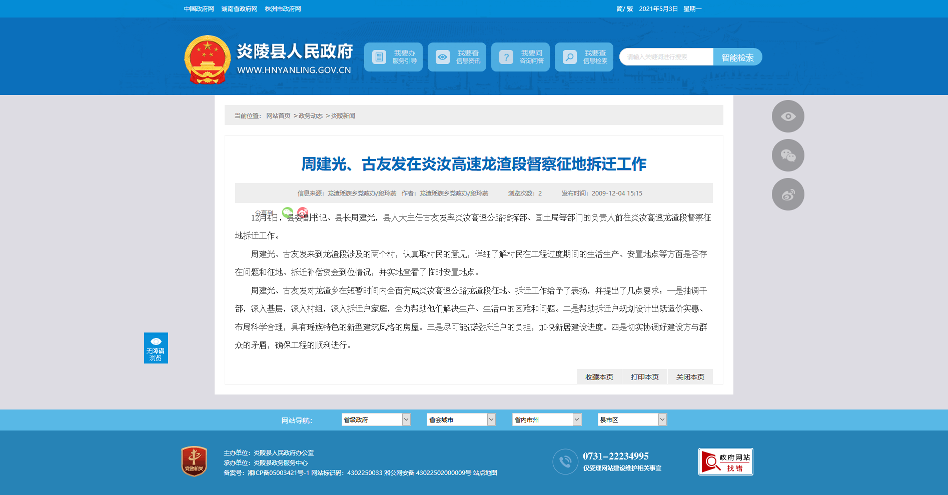 周建光、古友发对龙渣乡在短暂时间内全面完成炎汝高速公路龙渣段征地、拆迁工作给予了表扬,并提出了几点要求:一是抽调干部,深入基层,深入村组,深入拆迁户家庭,全力帮助他们解决生产、生活中的困难和问题。二是帮助拆迁户规划设计出既造价实惠、布局科学合理,具有瑶族特色的新型建筑风格的房屋。三是尽可能减轻拆迁户的负担,加快新居建设进度。四是切实协调好建设方与群众的矛盾,确保工程的顺利进行。