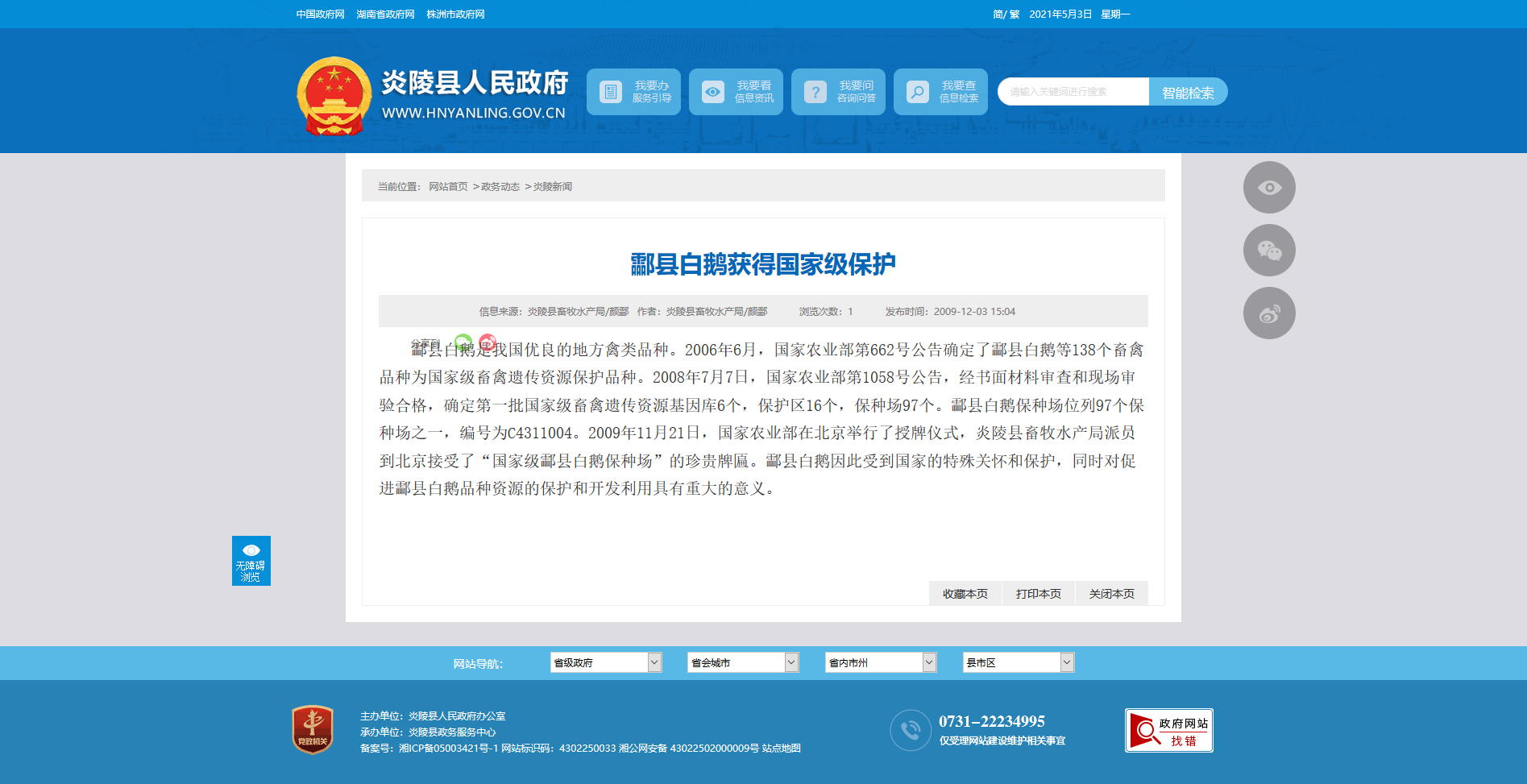 酃县白鹅是我国优良的地方禽类品种。2006年6月,国家农业部第662号公告确定了酃县白鹅等138个畜禽品种为国家级畜禽遗传资源保护品种。2008年7月7日,国家农业部第1058号公告,经书面材料审查和现场审验合格,确定第一批国家级畜禽遗传资源基因库6个,保护区16个,保种场97个。酃县白鹅保种场位列97个保种场之一,编号为C4311004。2009年11月21日,国家农业部在北京举行了授牌仪式,炎陵县畜牧水产局派员到北京接受了“国家级酃县白鹅保种场”的珍贵牌匾。酃县白鹅因此受到国家的特殊关怀和保护,同时对促进酃县白鹅品种资源的保护和开发利用具有重大的意义。