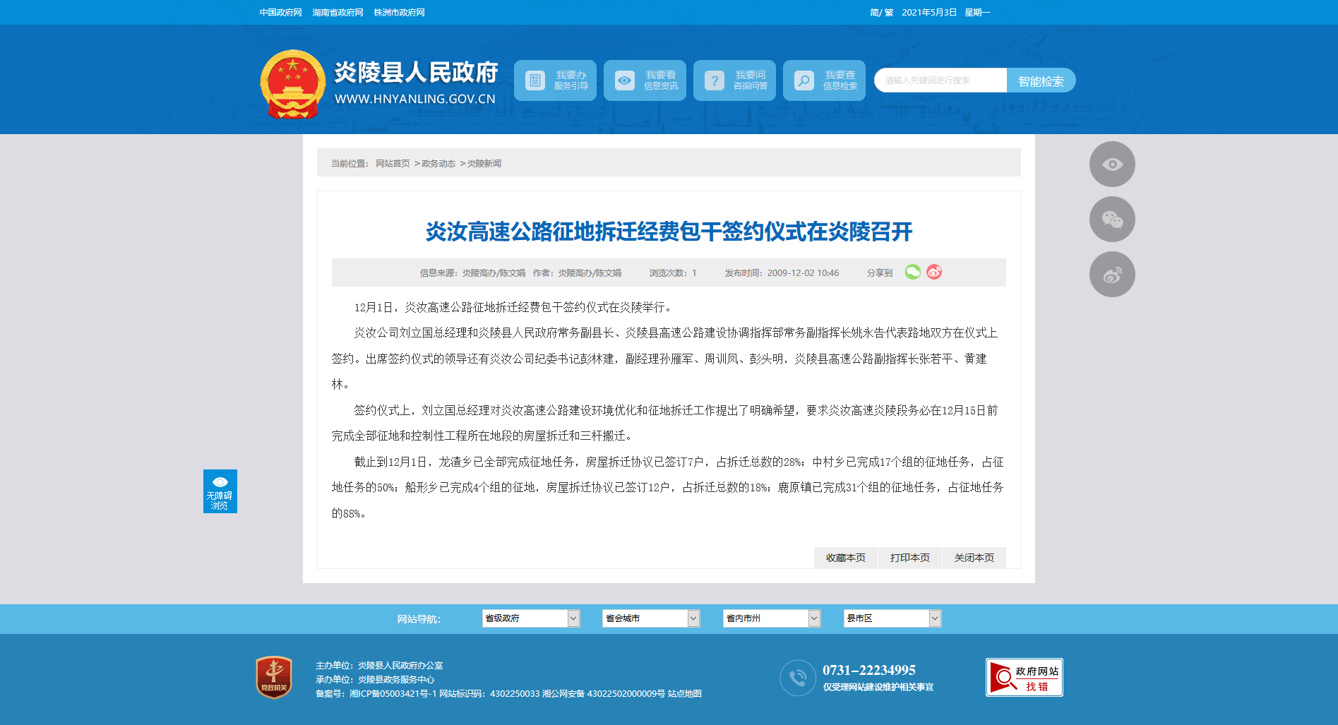 签约仪式上,刘立国总经理对炎汝高速公路建设环境优化和征地拆迁工作提出了明确希望,要求炎汝高速炎陵段务必在12月15日前完成全部征地和控制性工程所在地段的房屋拆迁和三杆搬迁。
