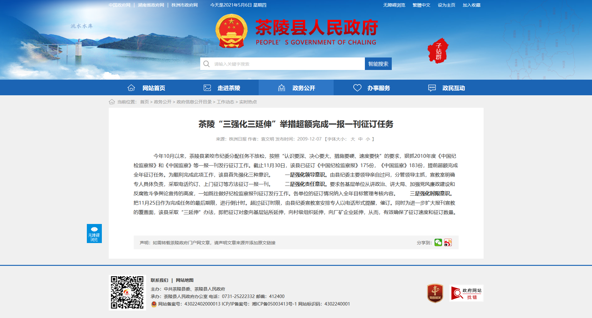 今年10月以来,茶陵县紧咬市纪委分配任务不放松,按照“认识要深、决心要大、措施要硬、速度要快”的要求,狠抓2010年度《中国纪检监察报》和《中国监察》等一报一刊发行征订工作。截止11月30日,该县已征订《中国纪检监察报》175份,《中国监察》183份,提前超额完成全年征订任务。为顺利完成此项工作,该县首先强化三种意识。 一是强化领导意识。由县纪委主要领导亲自过问,分管领导主抓,宣教室明确专人具体负责,采取电话约订、上门征订等方法征订一报一刊。 二是强化责任意识。要求各基层单位从讲政治、讲大局、加强党风廉政建设和反腐败斗争舆论宣传的高度,一如既往做好纪检监察报刊征订发行工作。各单位的征订情况纳入全年目标管理考核内容。 三是强化时限意识。把11月25日作为完成任务的最后期限,进行倒计时。超过征订时限,由县纪委宣教室安排专人以电话形式提醒,催订。同时为进一步扩大报刊宣教的覆盖面,该县采取“三延伸”办法,即把征订对象向基层站所延伸,向村级组织延伸,向厂矿企业延伸,从而,有效确保了征订速度和征订数量。