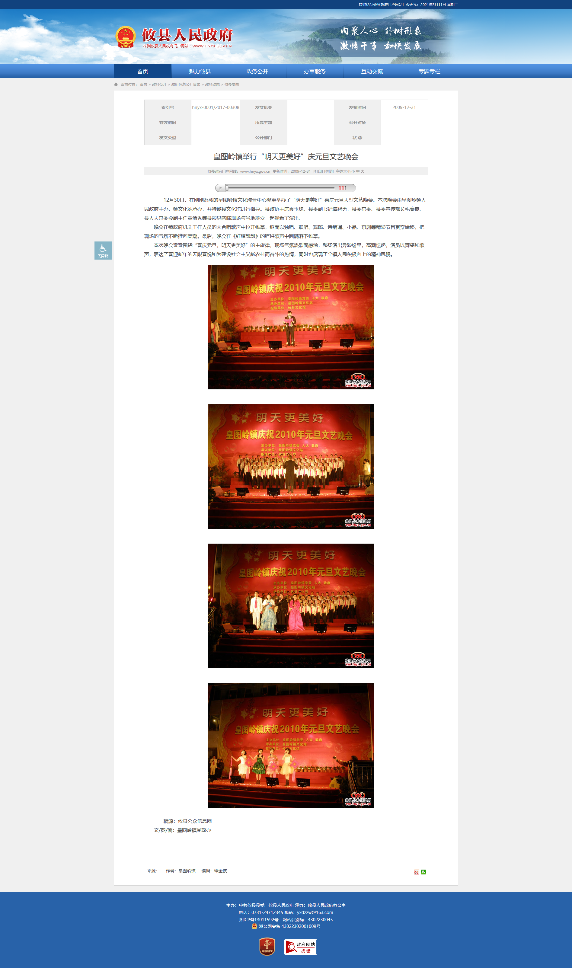 12月30日,在刚刚落成的皇图岭镇文化综合中心隆重举办了“明天更美好”喜庆元旦大型文艺晚会。本次晚会由皇图岭镇人民政府主办,镇文化站承办,并特邀县文化馆进行指导。县政协主席夏玉珠,县委副书记谭智勇,县委常委、县委宣传部长毛春良、县人大常委会副主任黄清秀等县领导亲临现场与当地群众一起观看了演出。