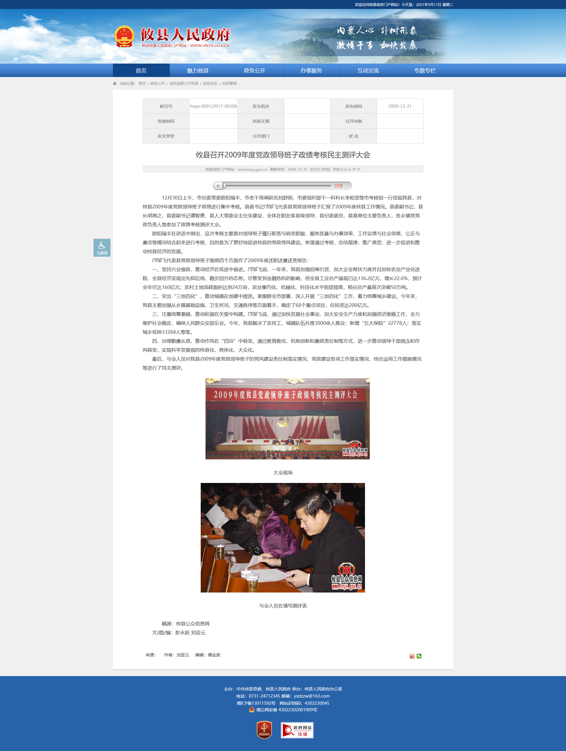 12月30日上午,市纪委常委欧阳瑞丰、市老干局调研员刘舒明、市委组织部干一科科长李柏坚等市考核组一行莅临我县,对攸县2009年度党政领导班子政绩进行集中考核。县委书记邝邹飞代表县党政领导班子汇报了2009年度攸县工作情况。县委副书记、县长胡湘之,县委副书记谭智勇,县人大常委会主任朱建设,全体在职在家县级领导,县纪委委员,县直单位主要负责人,各乡镇党党政负责人等参加了政绩考核测评大会。