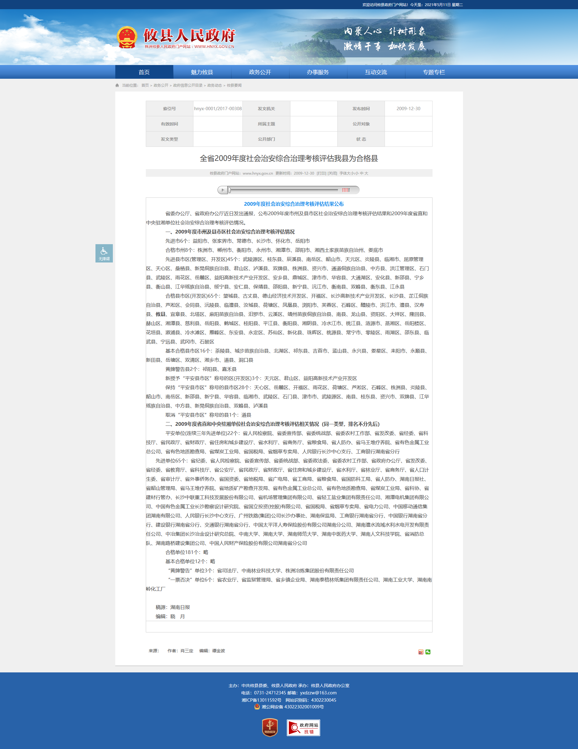 | 2009年度社会治安综合治理考核评估结果公布 省委办公厅、省政府办公厅近日发出通报,公布2009年度市州及县市区社会治安综合治理考核评估结果和2009年度省直和中央驻湘单位社会治安综合治理考核评估情况。 一、2009年度市州及县市区社会治安综合治理考核评估情况 先进市6个:益阳市、张家界市、常德市、长沙市、怀化市、岳阳市 合格市州8个:株洲市、郴州市、衡阳市、永州市、湘潭市、邵阳市、湘西土家族苗族自治州、娄底市 先进县市区(管理区、开发区)45个:武陵源区、桂东县、辰溪县、南岳区、韶山市、天元区、炎陵县、临湘市、屈原管理区、天心区、桑植县、新晃侗族自治县、君山区、泸溪县、双牌县、株洲县、资兴市、通道侗族自治县、中方县、洪江管理区、石门县、武陵区、雨花区、岳麓区、益阳高新技术产业开发区、安乡县、鼎城区、津市市、华容县、大通湖区、安化县、新邵县、宁乡县、衡山县、江华瑶族自治县、绥宁县、安仁县、保靖县、邵阳县、新宁县、沅江市、衡南县、双峰县、衡东县、江永县 合格县市区(开发区)65个:望城县、古丈县、德山经济技术开发区、开福区、长沙高新技术产业开发区、长沙县、芷江侗族自治县、芦淞区、会同县、沅陵县、临澧县、汝城县、荷塘区、凤凰县、浏阳市、芙蓉区、石峰区、醴陵市、洪江市、澧县、汉寿县、攸县、宜章县、北塔区、麻阳苗族自治县、汨罗市、云溪区、靖州苗族侗族自治县、南县、龙山县、资阳区、大祥区、隆回县、赫山区、湘潭县、慈利县、岳阳县、鹤城区、桂阳县、平江县、衡阳县、湘阴县、冷水江市、桃江县、涟源市、蒸湘区、岳阳楼区、花垣县、溆浦县、冷水滩区、雁峰区、东安县、永定区、苏仙区、新化县、珠晖区、桃源县、常宁市、零陵区、雨湖区、邵东县、临武县、宁远县、武冈市、石鼓区 基本合格县市区16个:茶陵县、城步苗族自治县、北湖区、祁东县、吉首市、蓝山县、永兴县、娄星区、耒阳市、永顺县、新田县、岳塘区、双清区、湘乡市、道县、洞口县 黄牌警告县2个:祁阳县、嘉禾县 新授予“平安县市区”称号的区(开发区)3个:天元区、君山区、益阳高新技术产业开发区 保持“平安县市区”称号的县市区28个:天心区、岳麓区、开福区、雨花区、荷塘区、芦淞区、石峰区、株洲县、炎陵县、韶山市、南岳区、新邵县、新宁县、华容县、临湘市、武陵区、石门县、津市市、武陵源区、南县、桂东县、资兴市、双牌县、江华瑶族自治县、中方县、新晃侗族自治县、双峰县、泸溪县 取消“平安县市区”称号的县1个:道县 二、2009年度省直和中央驻湘单位社会治安综合治理考核评估相关情况(同一类型,排名不分先后) 平安单位(连续三年先进单位)22个:省人民检察院、省委宣传部、省委统战部、省委农村工作部、省发改委、省经委、省科技厅、省民政厅、省财政厅、省住房和城乡建设厅、省水利厅、省商务厅、省粮食局、省人防办、省马王堆疗养院、省有色金属工业总公司、省有色地质勘查局、省煤炭工业局、省国税局、省烟草专卖局、人民银行长沙中心支行、工商银行湖南省分行 合格单位181个:略 基本合格单位12个:略 “黄牌警告”单位3个:省司法厅、中南林业科技大学、株洲冶炼集团股份有限责任公司 “一票否决”单位6个:省农业厅、省监狱管理局、省乡镇企业局、湖南泰格林纸集团有限责任公司、湖南工业大学、湖南南岭化工厂 |