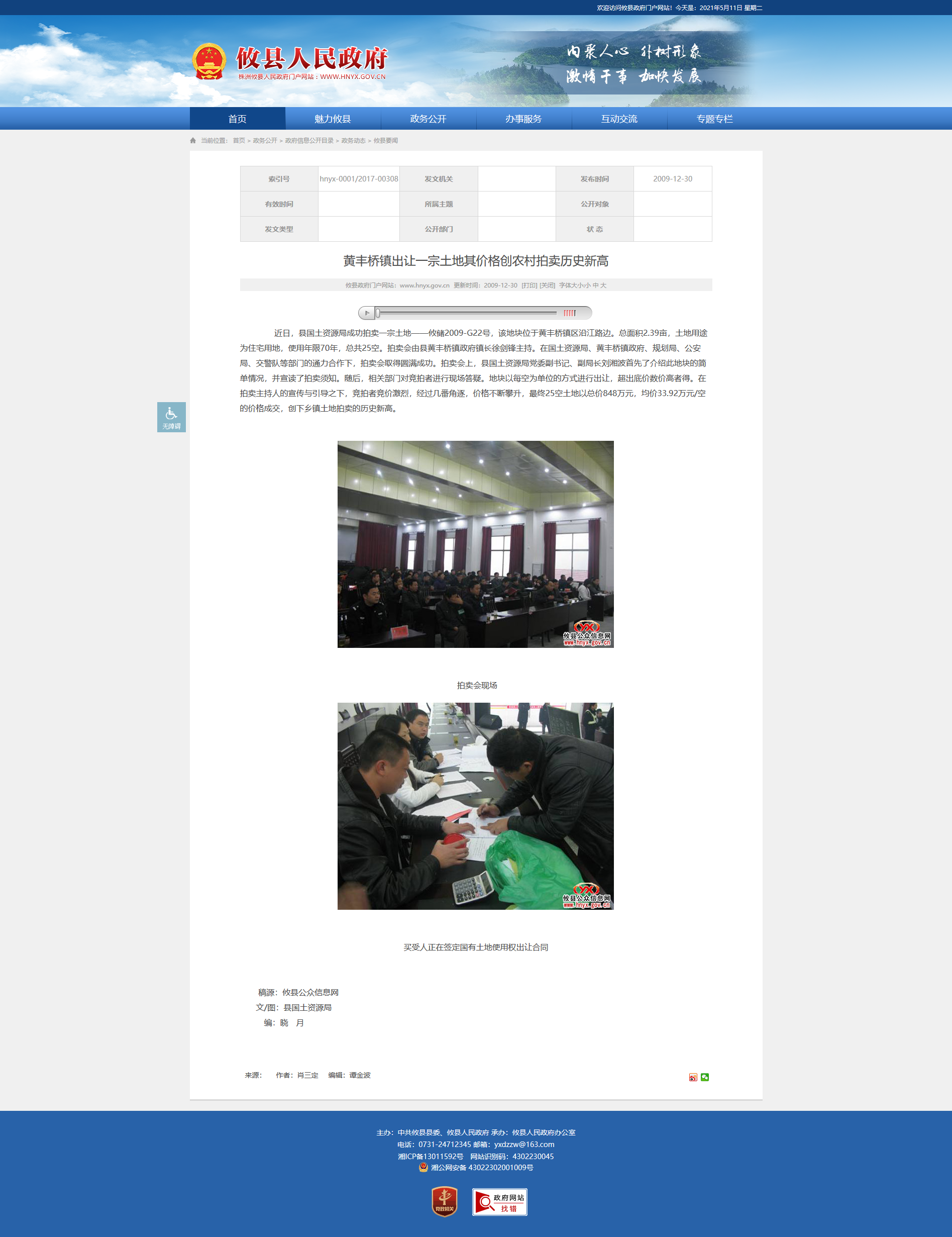 近日,县国土资源局成功拍卖一宗土地——攸储2009-G22号,该地块位于黄丰桥镇区沿江路边。总面积2.39亩,土地用途为住宅用地,使用年限70年,总共25空。拍卖会由县黄丰桥镇政府镇长徐剑锋主持。在国土资源局、黄丰桥镇政府、规划局、公安局、交警队等部门的通力合作下,拍卖会取得圆满成功。拍卖会上,县国土资源局党委副书记、副局长刘湘波首先了介绍此地块的简单情况,并宣读了拍卖须知。随后,相关部门对竞拍者进行现场答疑。地块以每空为单位的方式进行出让,超出底价数价高者得。在拍卖主持人的宣传与引导之下,竞拍者竞价激烈,经过几番角逐,价格不断攀升,最终25空土地以总价848万元,均价33.92万元/空的价格成交,创下乡镇土地拍卖的历史新高。