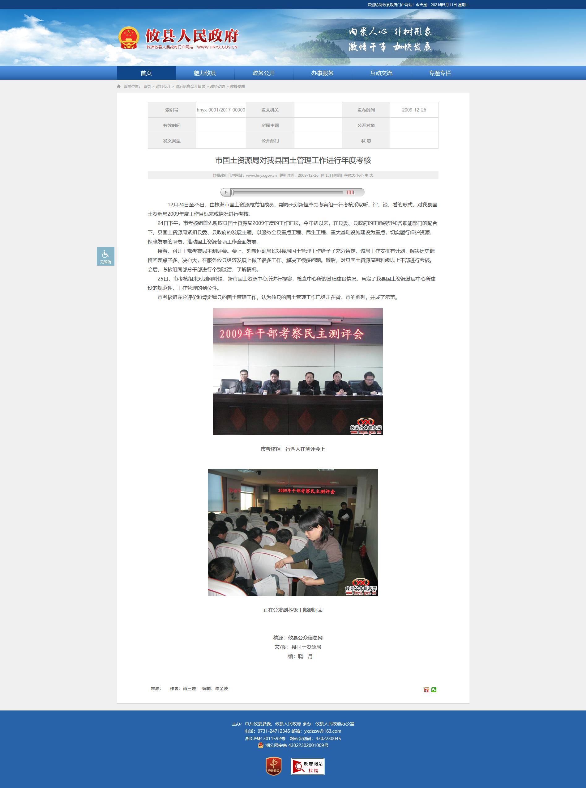 12月24日至25日,由株洲市国土资源局党组成员、副局长刘新恒率领考察组一行考核采取听、评、谈、看的形式,对我县国土资源局2009年度工作目标完成情况进行考核。