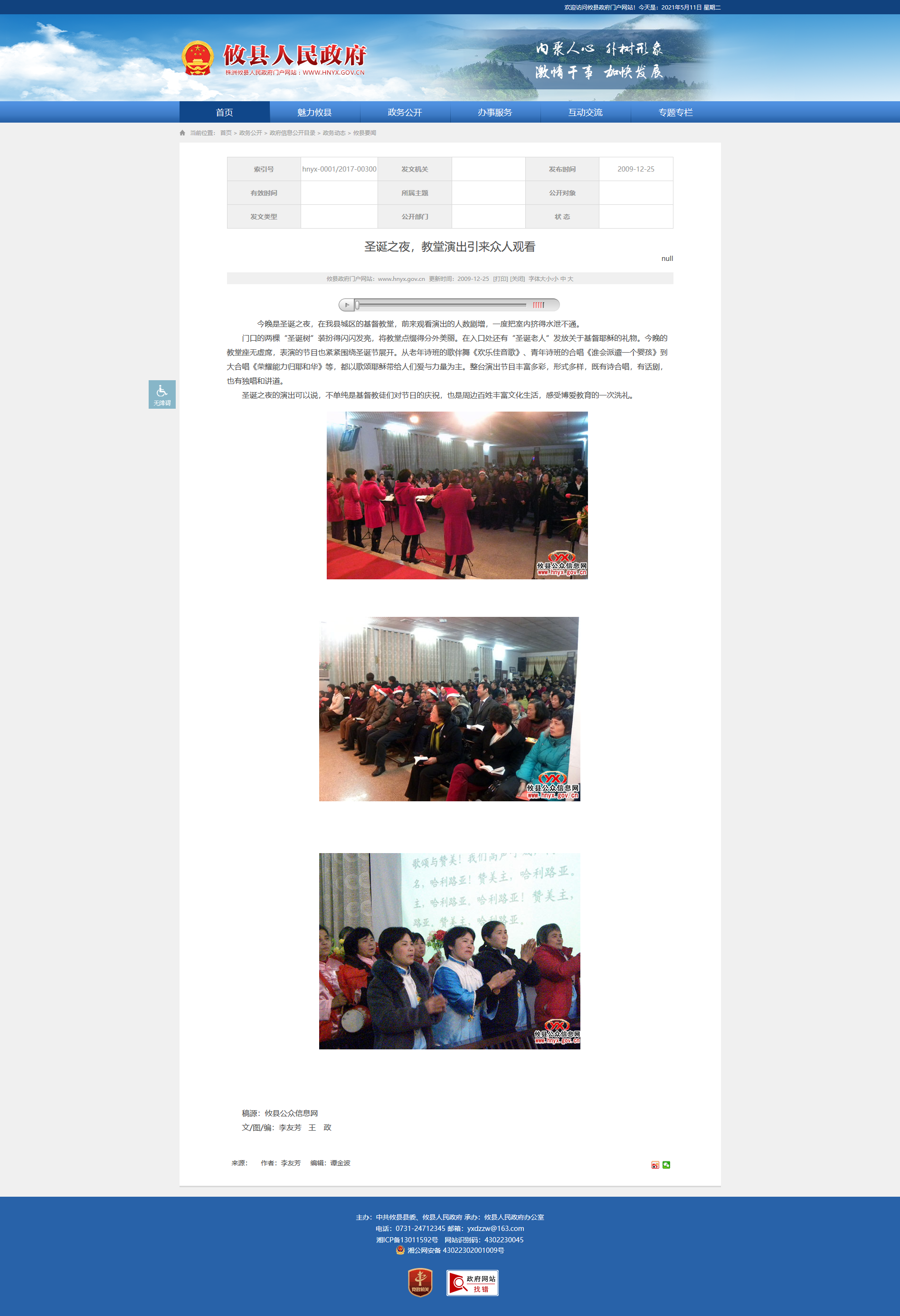 门口的两棵“圣诞树”装扮得闪闪发亮,将教堂点缀得分外美丽。在入口处还有“圣诞老人”发放关于基督耶稣的礼物。今晚的教堂座无虚席,表演的节目也紧紧围绕圣诞节展开。从老年诗班的歌伴舞《欢乐佳音歌》、青年诗班的合唱《谁会派遣一个婴孩》到大合唱《荣耀能力归耶和华》等,都以歌颂耶稣带给人们爱与力量为主。整台演出节目丰富多彩,形式多样,既有诗合唱,有话剧,也有独唱和讲道。
