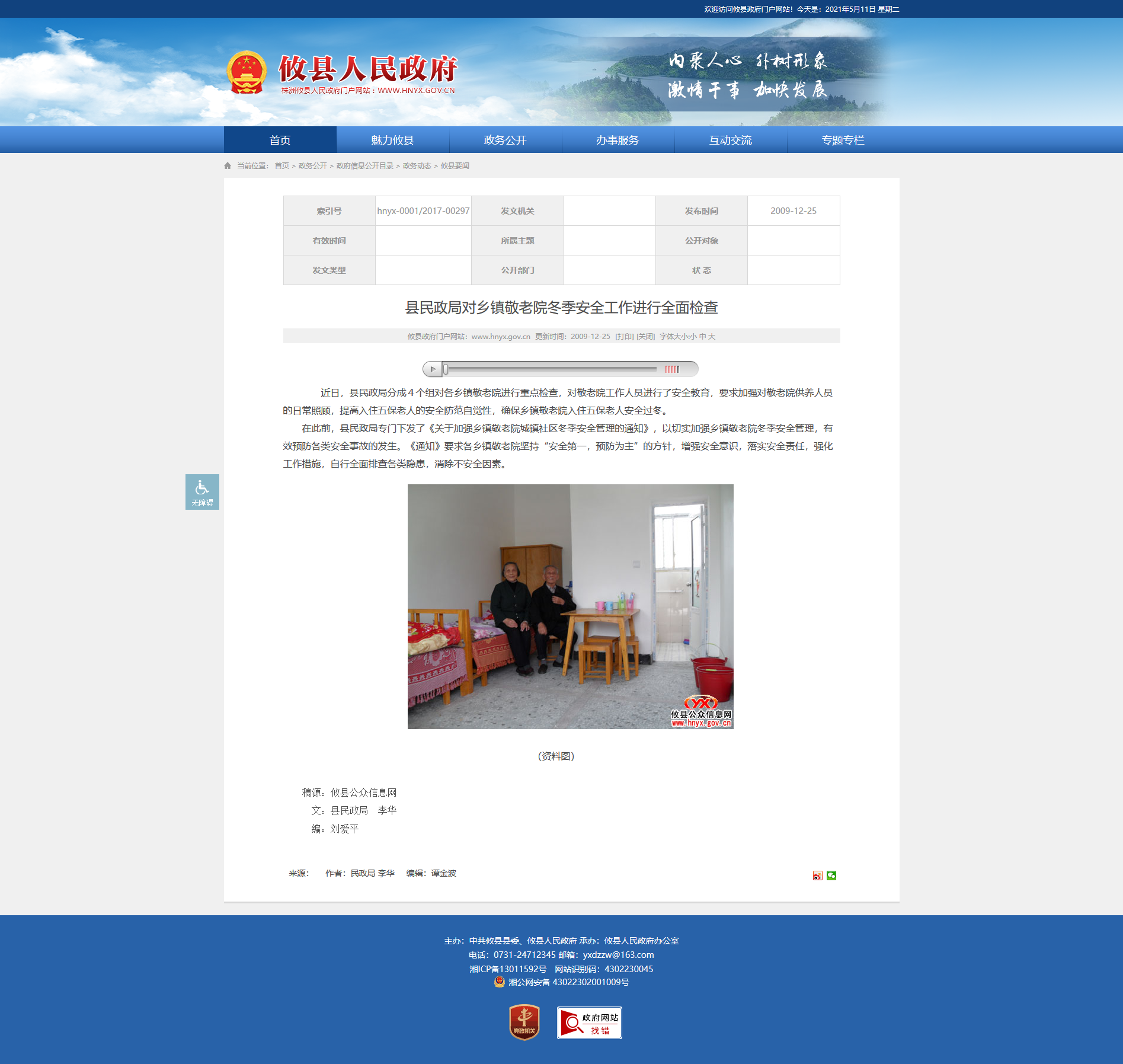 近日,县民政局分成4个组对各乡镇敬老院进行重点检查,对敬老院工作人员进行了安全教育,要求加强对敬老院供养人员的日常照顾,提高入住五保老人的安全防范自觉性,确保乡镇敬老院入住五保老人安全过冬。