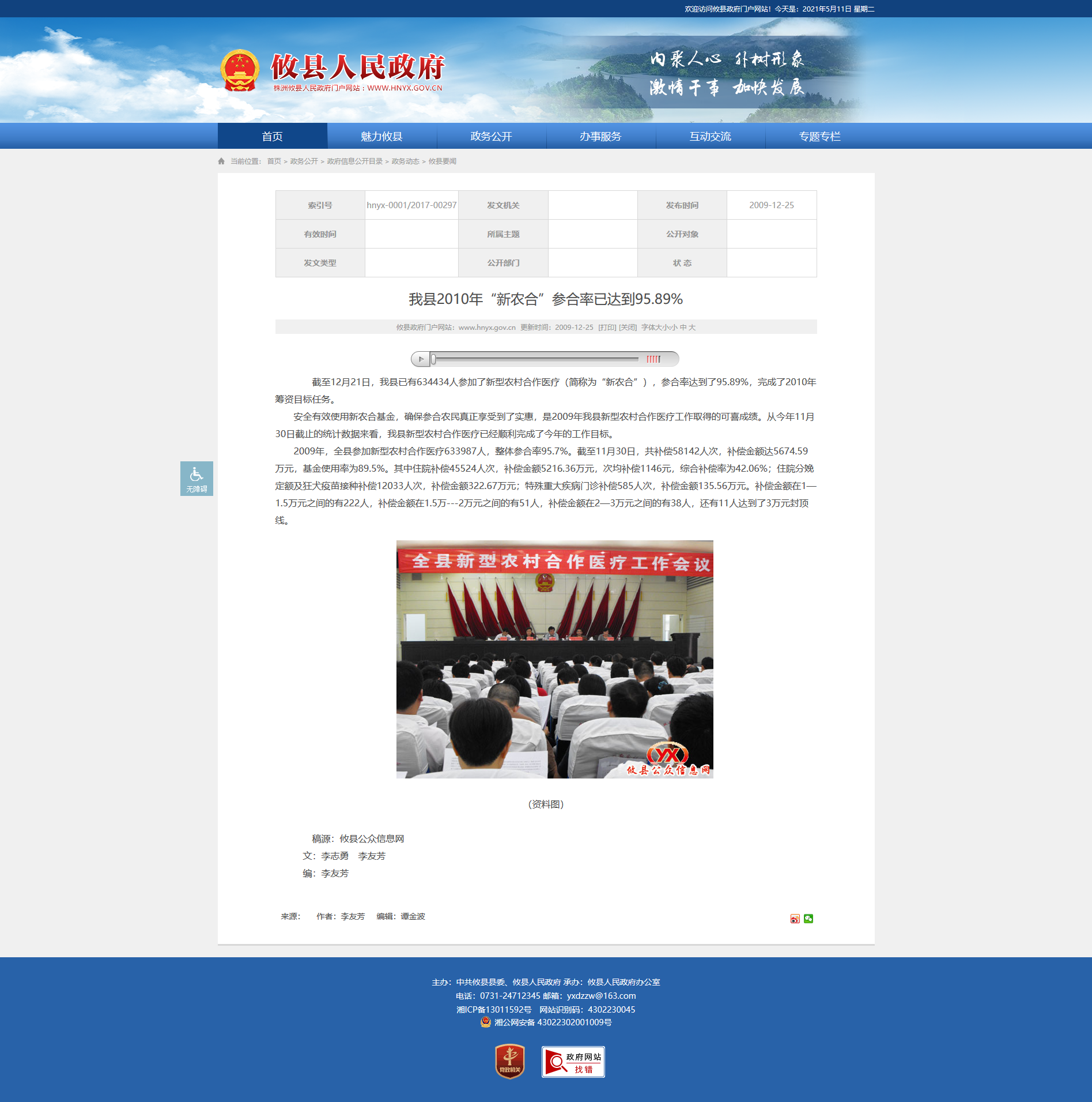截至12月21日,我县已有634434人参加了新型农村合作医疗(简称为“新农合”),参合率达到了95.89%,完成了2010年筹资目标任务。