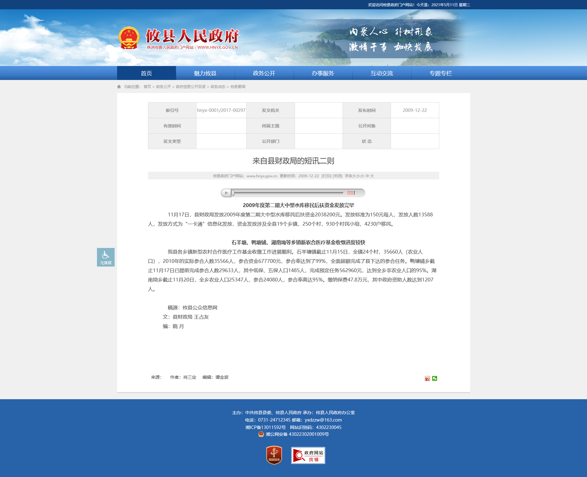 11月17日,县财政局发放2009年度第二期大中型水库移民后扶资金2038200元。发放标准为150元每人,发放人数13588人,发放方式为“一卡通”信息化发放,资金发放涉及全县19个乡镇,250个村,930个村民小组,4230户移民。