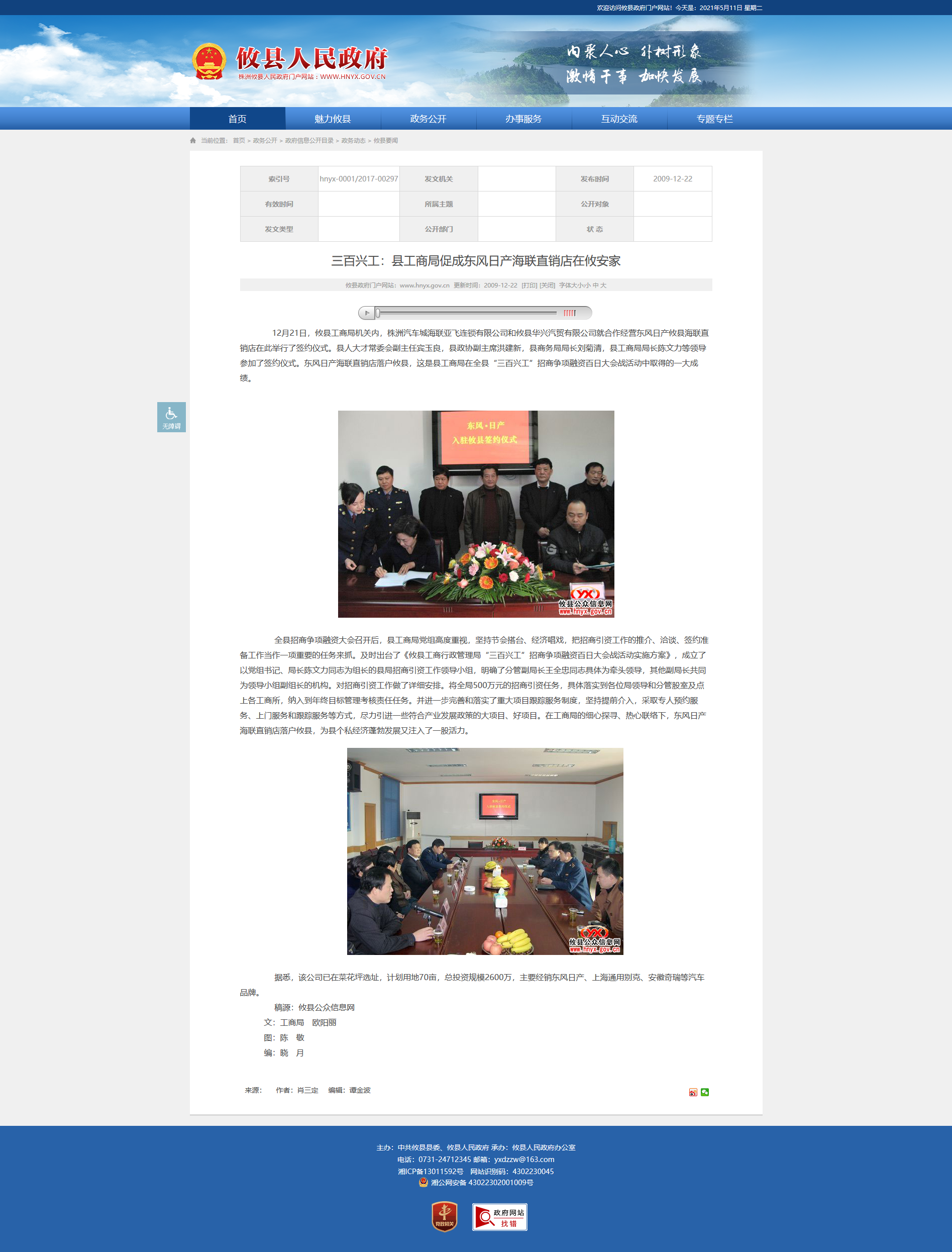 12月21日,攸县工商局机关内,株洲汽车城海联亚飞连锁有限公司和攸县华兴汽贸有限公司就合作经营东风日产攸县海联直销店在此举行了签约仪式。县人大才常委会副主任宾玉良,县政协副主席洪建新,县商务局局长刘菊清,县工商局局长陈文力等领导参加了签约仪式。东风日产海联直销店落户攸县,这是县工商局在全县“三百兴工”招商争项融资百日大会战活动中取得的一大成绩。