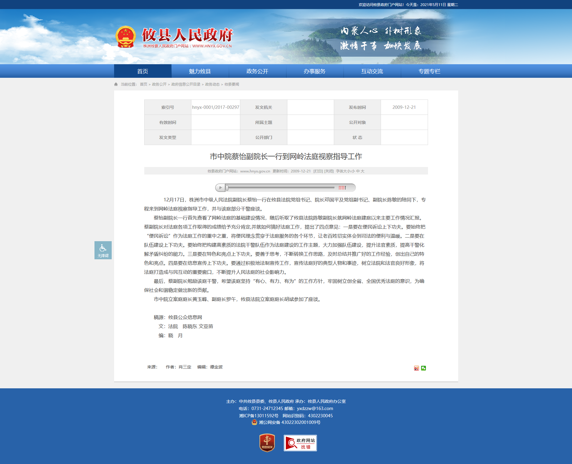12月17日,株洲市中级人民法院副院长蔡怡一行在攸县法院党组书记、院长邓国平及党组副书记、副院长陈敏的陪同下,专程来到网岭法庭视察指导工作,并与该庭部分干警座谈。