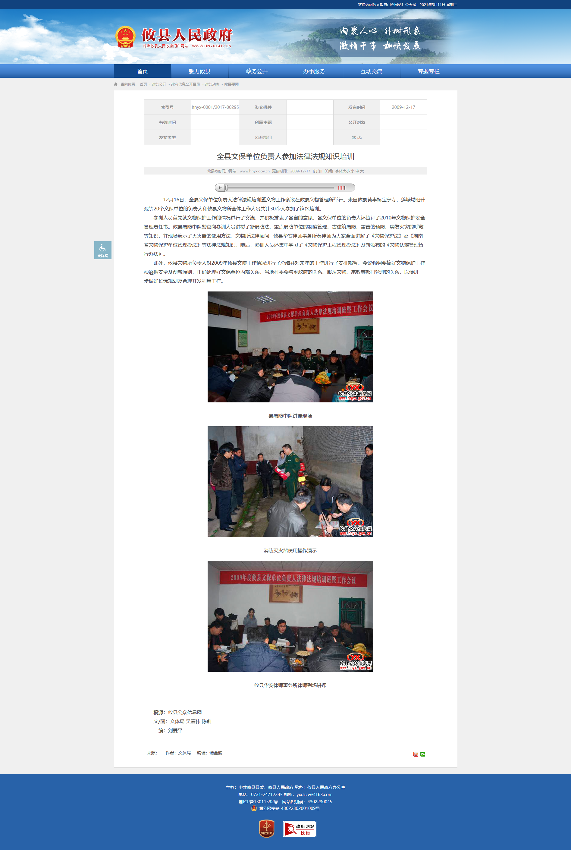 参训人员首先就文物保护工作的情况进行了交流,并积极发表了各自的意见,各文保单位的负责人还签订了2010年文物保护安全管理责任书。攸县消防中队警官向参训人员讲授了新消防法、重点消防单位的制度管理、古建筑消防、雷击的预防、突发火灾的呼救等知识,并现场演示了灭火器的使用方法。文物所法律顾问--攸县华安律师事务所黄律师为大家全面讲解了《文物保护法》及《湖南省文物保护单位管理办法》等法律法规知识。随后,参训人员还集中学习了《文物保护工程管理办法》及新颁布的《文物认定管理暂行办法》。