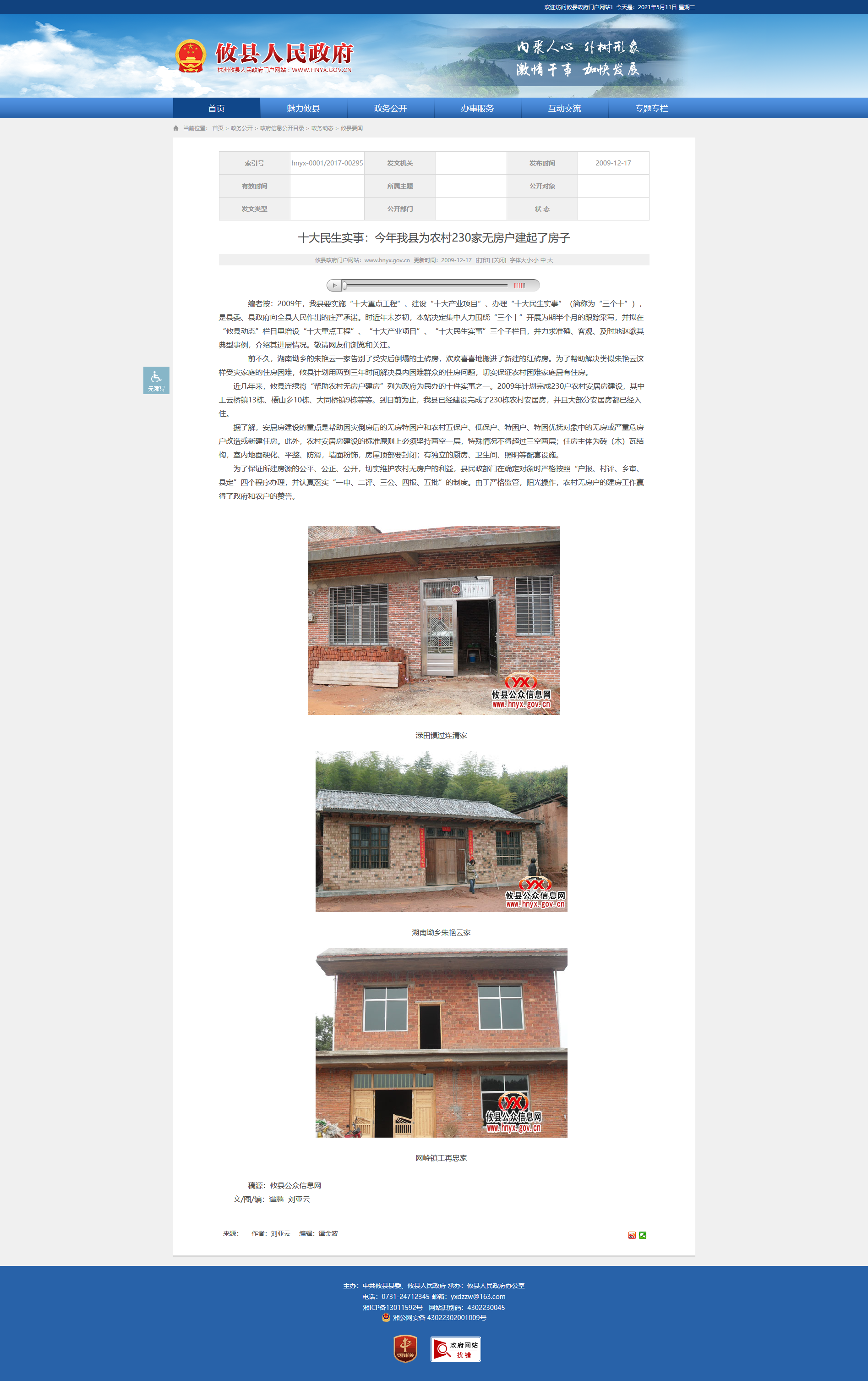 近几年来,攸县连续将“帮助农村无房户建房”列为政府为民办的十件实事之一。2009年计划完成230户农村安居房建设,其中上云桥镇13栋、槚山乡10栋、大同桥镇9栋等等。到目前为止,我县已经建设完成了230栋农村安居房,并且大部分安居房都已经入住。