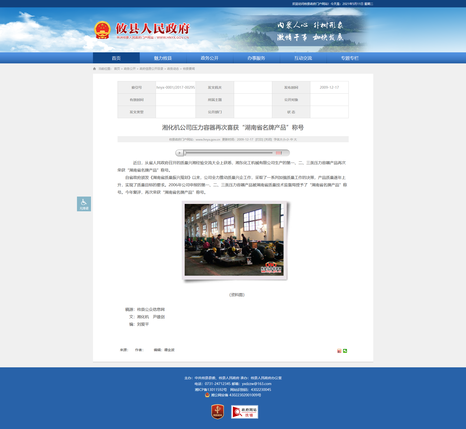 自省政府颁发《湖南省质量振兴规划》以来,公司全力推动质量兴企工作,采取了一系列加强质量工作的决策,产品质量逐年上升,实现了质量目标的要求。2006年公司申报的第一、二、三类压力容器产品被湖南省质量技术监督局授予了“湖南省名牌产品”称号。今年复评,再次荣获“湖南省名牌产品”称号。