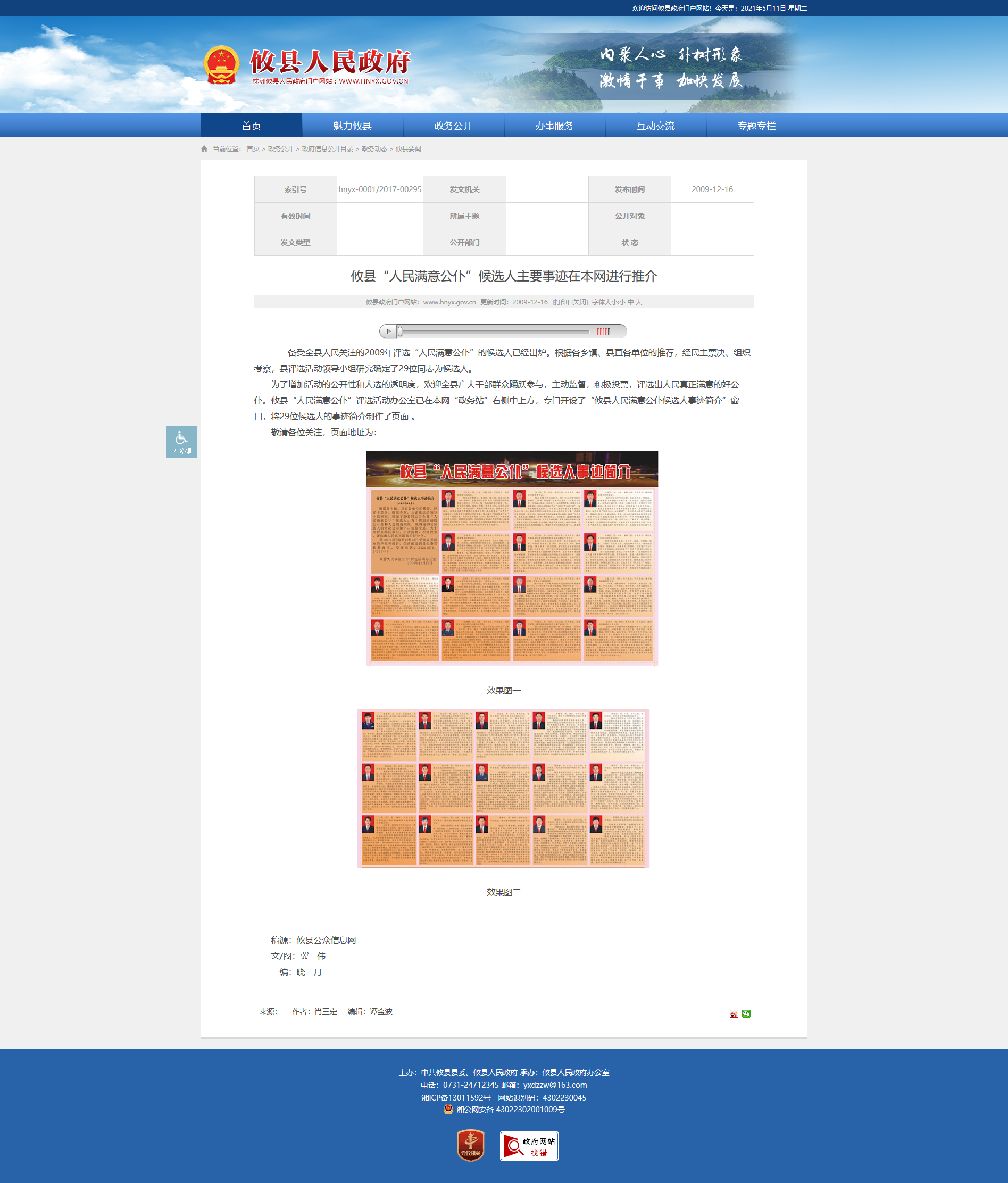为了增加活动的公开性和人选的透明度,欢迎全县广大干部群众踊跃参与,主动监督,积极投票,评选出人民真正满意的好公仆。攸县“人民满意公仆”评选活动办公室已在本网“政务站”右侧中上方,专门开设了“攸县人民满意公仆候选人事迹简介”窗口,将29位候选人的事迹简介制作了页面 。