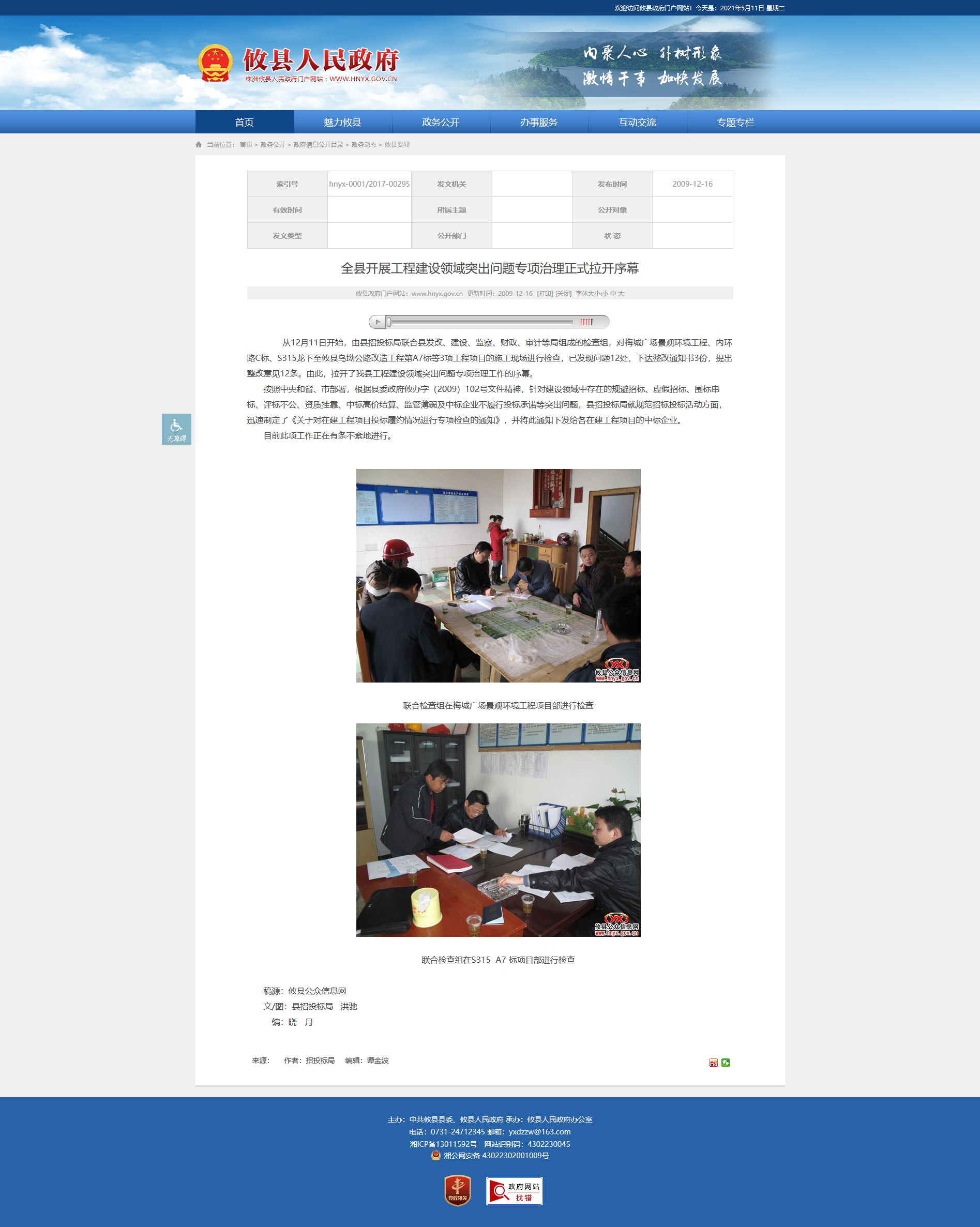 从12月11日开始,由县招投标局联合县发改、建设、监察、财政、审计等局组成的检查组,对梅城广场景观环境工程、内环路C标、S315龙下至攸县乌坳公路改造工程第A7标等3项工程项目的施工现场进行检查,已发现问题12处,下达整改通知书3份,提出整改意见12条。由此,拉开了我县工程建设领域突出问题专项治理工作的序幕。