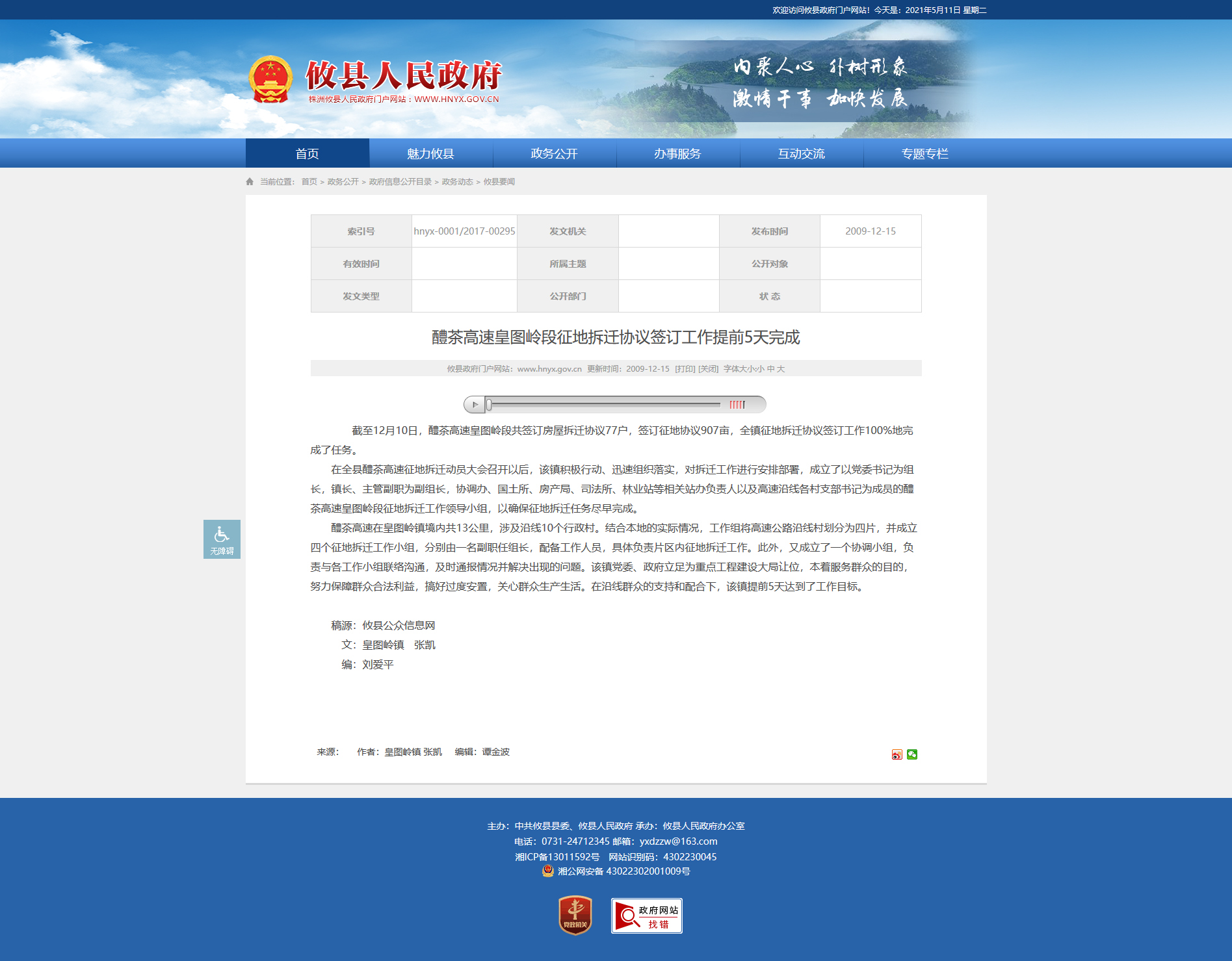 截至12月10日,醴茶高速皇图岭段共签订房屋拆迁协议77户,签订征地协议907亩,全镇征地拆迁协议签订工作100%地完成了任务。