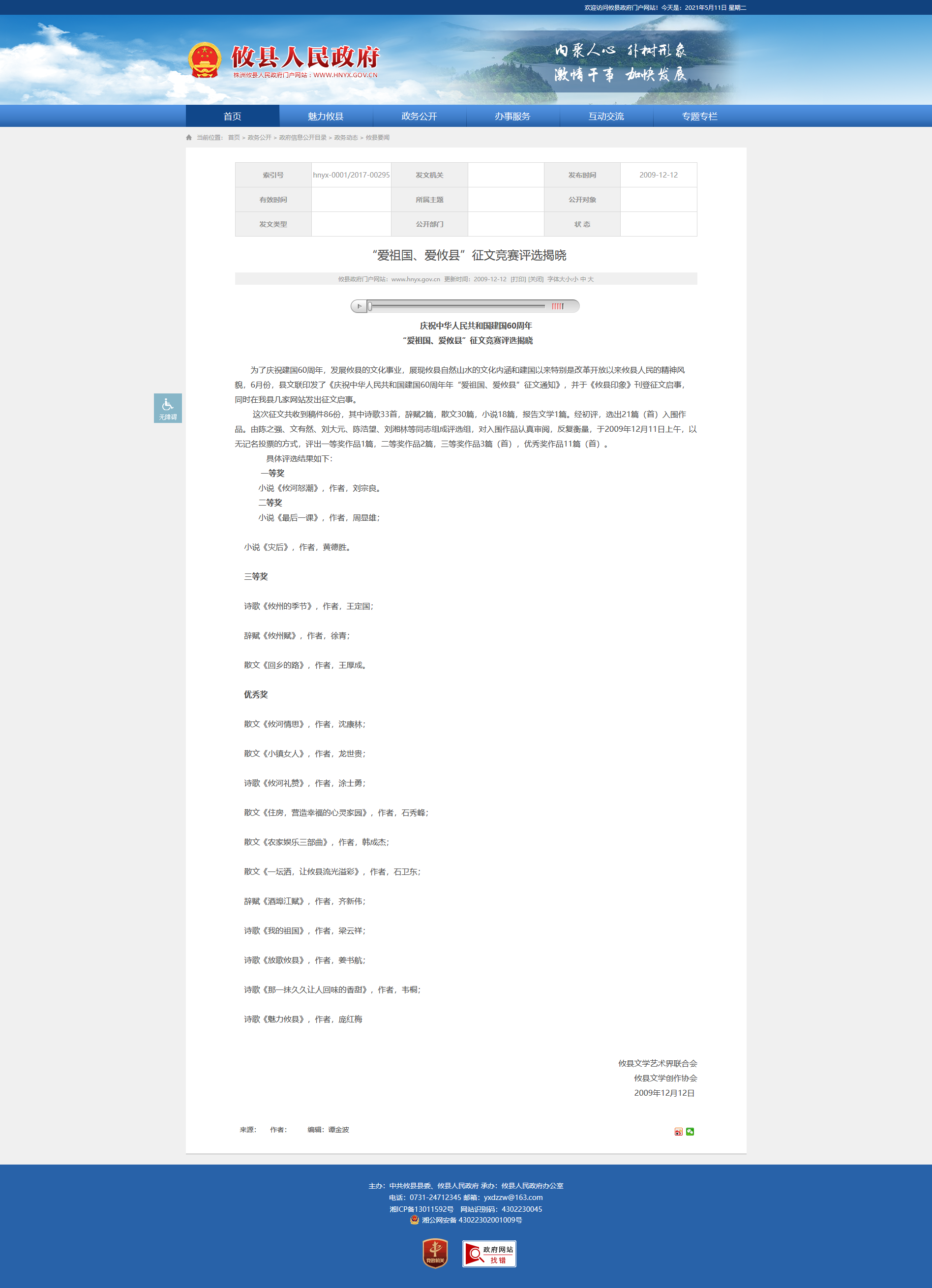 这次征文共收到稿件86份,其中诗歌33首,辞赋2篇,散文30篇,小说18篇,报告文学1篇。经初评,选出21篇(首)入围作品。由陈之强、文有然、刘大元、陈浩望、刘湘林等同志组成评选组,对入围作品认真审阅,反复衡量,于2009年12月11日上午,以无记名投票的方式,评出一等奖作品1篇,二等奖作品2篇,三等奖作品3篇(首),优秀奖作品11篇(首)。