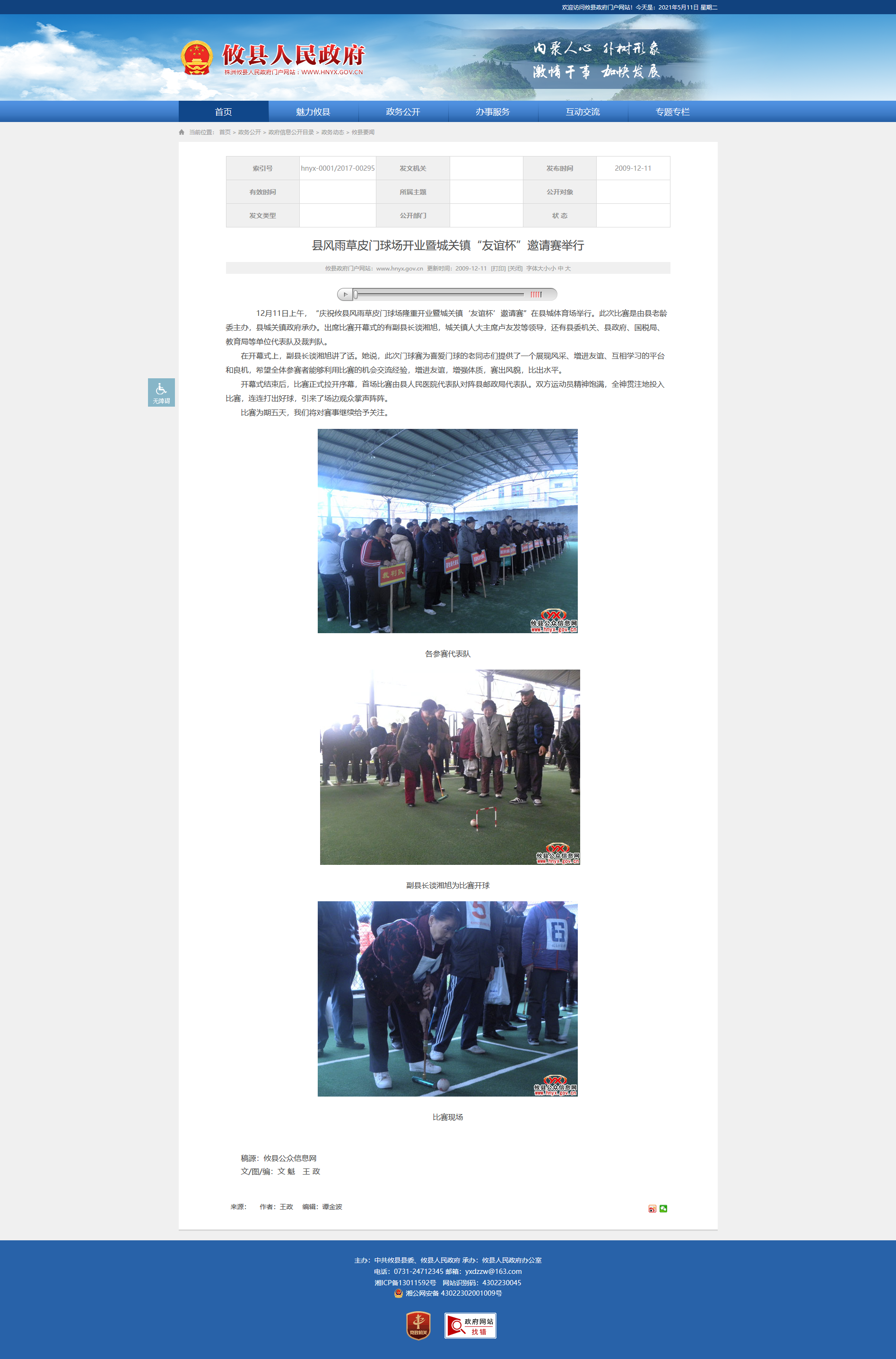 12月11日上午,“庆祝攸县风雨草皮门球场隆重开业暨城关镇‘友谊杯’邀请赛”在县城体育场举行。此次比赛是由县老龄委主办,县城关镇政府承办。出席比赛开幕式的有副县长谈湘旭,城关镇人大主席卢友发等领导,还有县委机关、县政府、国税局、教育局等单位代表队及裁判队。