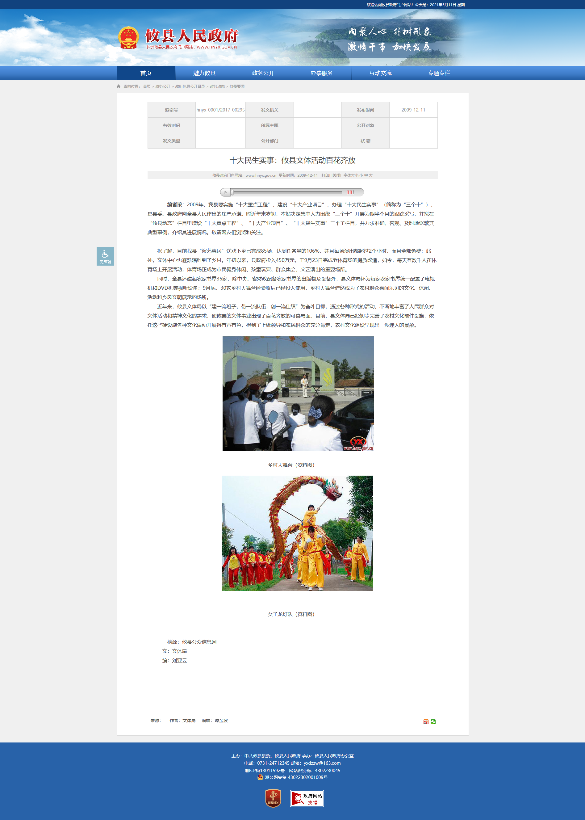 近年来,攸县文体局以“建一流班子,带一流队伍,创一流佳绩”为奋斗目标,通过各种形式的活动,不断地丰富了人民群众对文体活动和精神文化的需求,使攸县的文体事业出现了百花齐放的可喜局面。目前,县文体局已经初步完善了农村文化硬件设施,依托这些硬设施各种文化活动开展得有声有色,得到了上级领导和农民群众的充分肯定,农村文化建设呈现出一派迷人的景象。