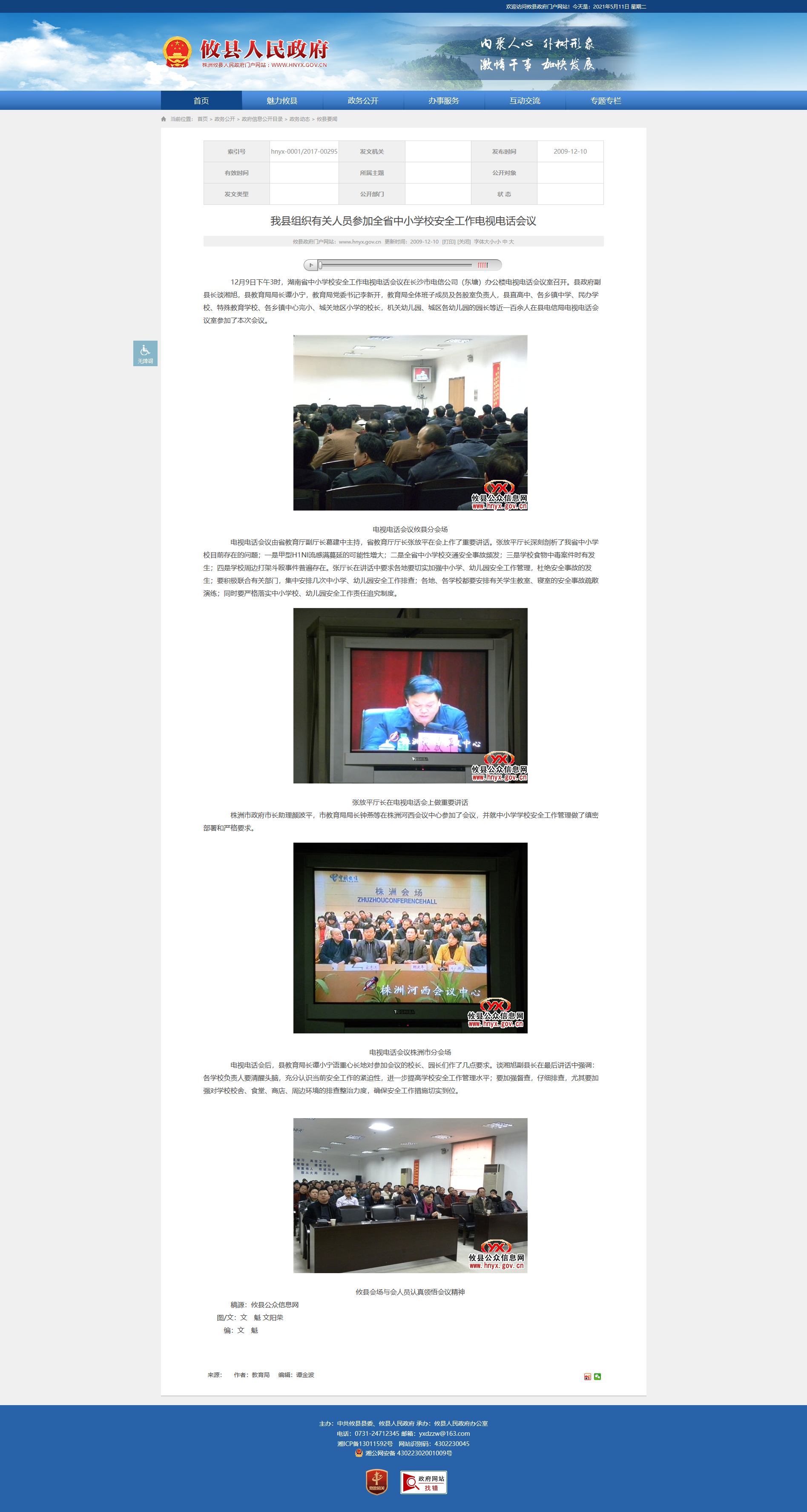 12月9日下午3时,湖南省中小学校安全工作电视电话会议在长沙市电信公司(东塘)办公楼电视电话会议室召开。县政府副县长谈湘旭,县教育局局长谭小宁,教育局党委书记李新开,教育局全体班子成员及各股室负责人,县直高中、各乡镇中学、民办学校、特殊教育学校、各乡镇中心完小、城关地区小学的校长,机关幼儿园、城区各幼儿园的园长等近一百余人在县电信局电视电话会议室参加了本次会议。