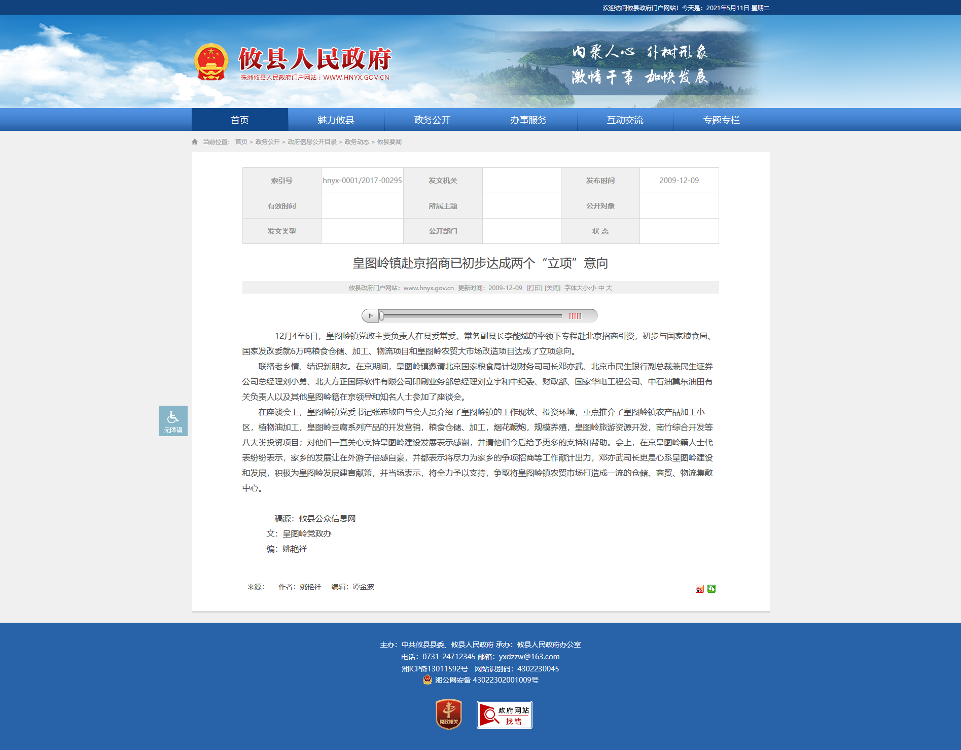 12月4至6日,皇图岭镇党政主要负责人在县委常委、常务副县长李能斌的率领下专程赴北京招商引资,初步与国家粮食局、国家发改委就6万吨粮食仓储、加工、物流项目和皇图岭农贸大市场改造项目达成了立项意向。