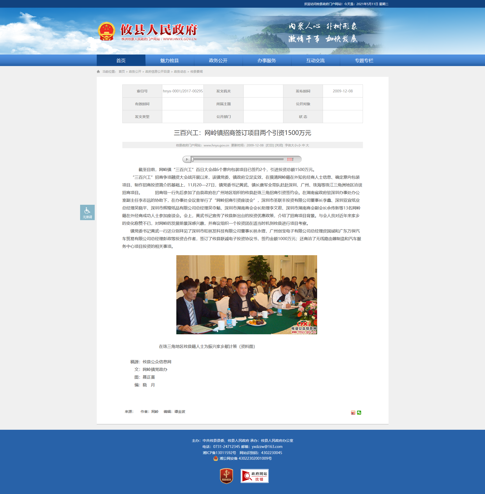 镇党委书记黄武一行还分别拜见了深圳市旺林发科技有限公司董事长林永铿,广州创宝电子有限公司总经理皮国斌和广东万保汽车贸易有限公司总经理彭政等投资合作者,签订了攸县联诚电子投资协议书,签约金额1000万元;还商洽了无线路由器制造和汽车服务中心项目投资的相关事项。