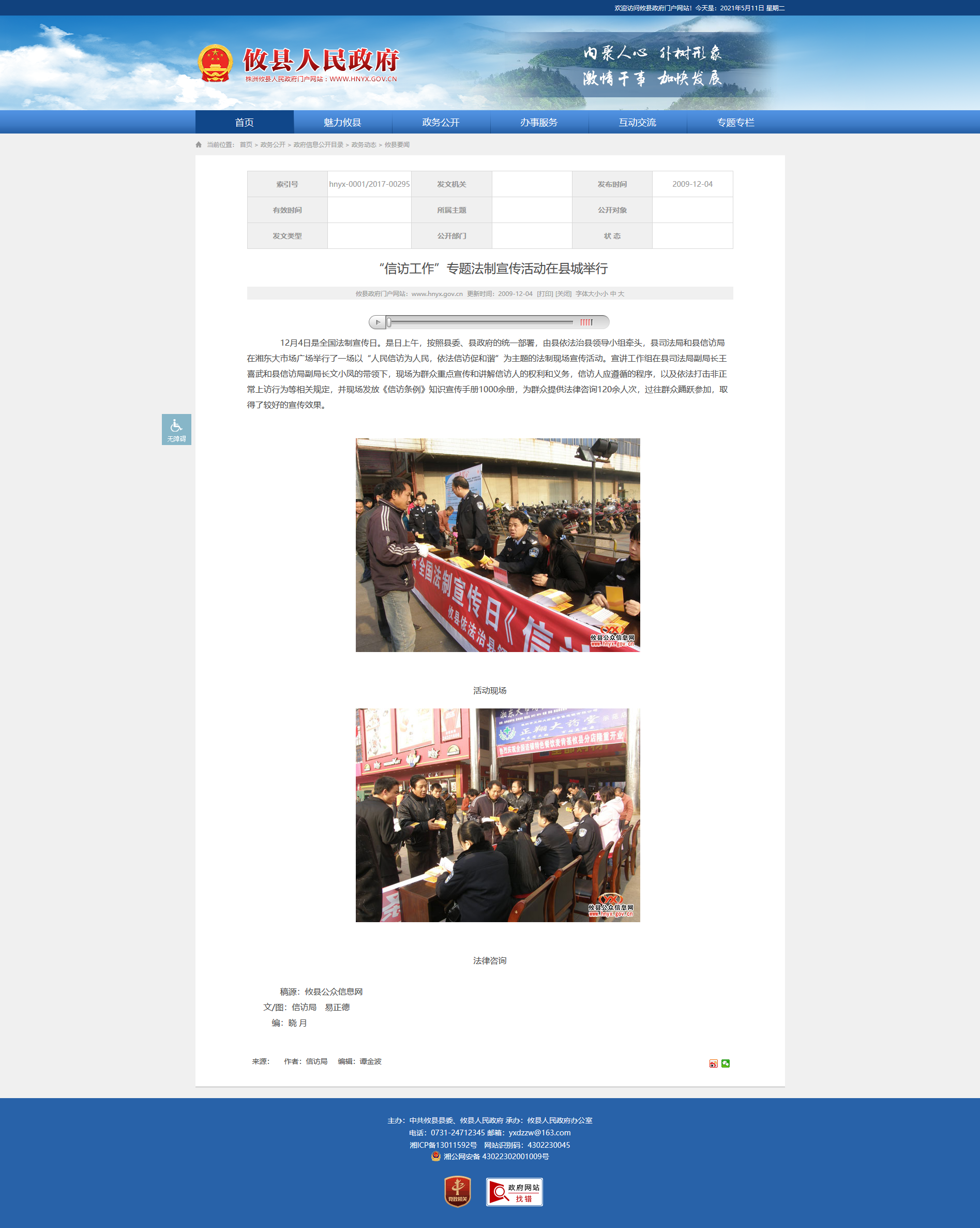 12月4日是全国法制宣传日。是日上午,按照县委、县政府的统一部署,由县依法治县领导小组牵头,县司法局和县信访局在湘东大市场广场举行了一场以“人民信访为人民,依法信访促和谐”为主题的法制现场宣传活动。宣讲工作组在县司法局副局长王喜武和县信访局副局长文小凤的带领下,现场为群众重点宣传和讲解信访人的权利和义务,信访人应遵循的程序,以及依法打击非正常上访行为等相关规定,并现场发放《信访条例》知识宣传手册1000余册,为群众提供法律咨询120余人次,过往群众踊跃参加,取得了较好的宣传效果。