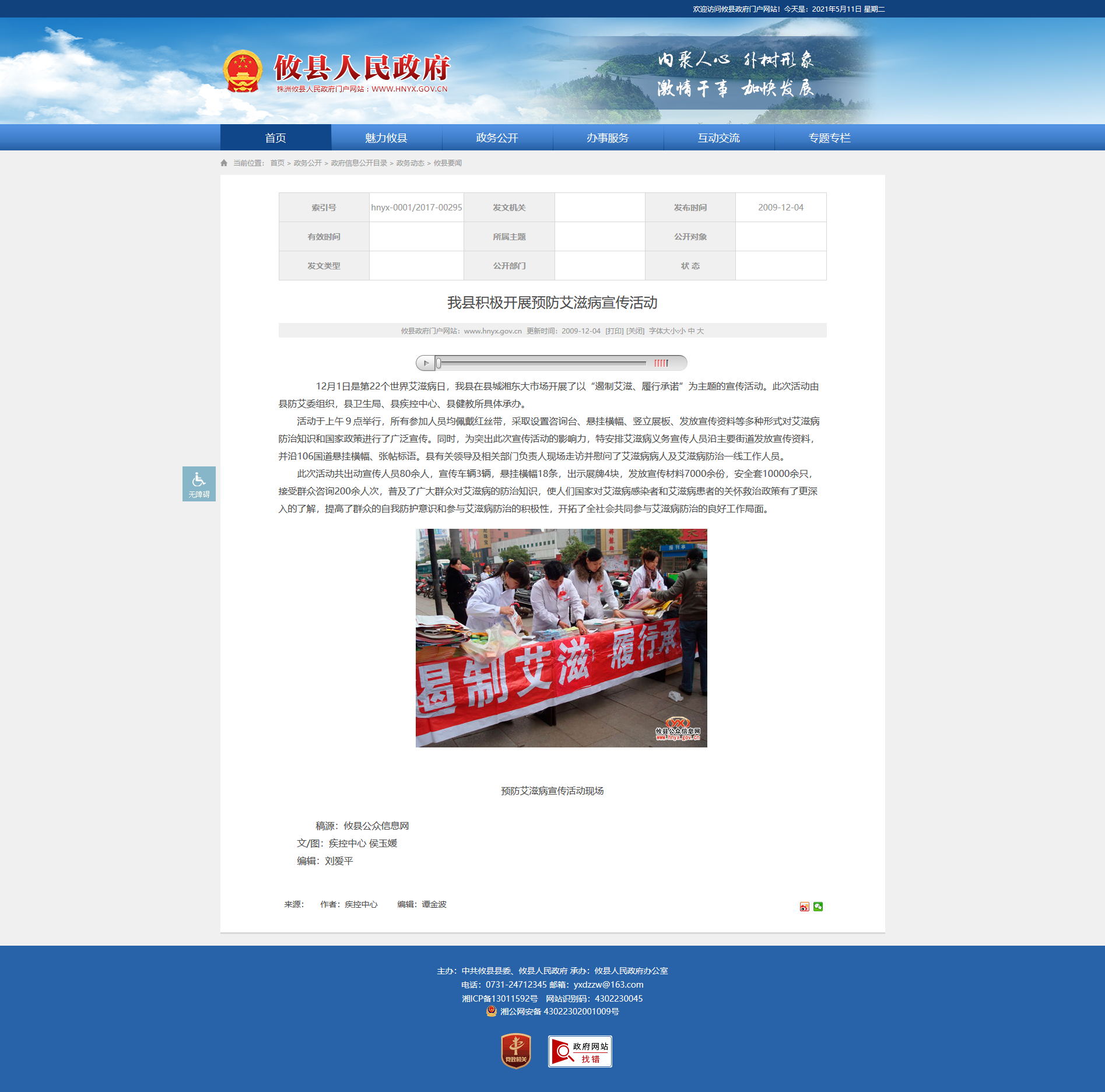 活动于上午9点举行,所有参加人员均佩戴红丝带,采取设置咨询台、悬挂横幅、竖立展板、发放宣传资料等多种形式对艾滋病防治知识和国家政策进行了广泛宣传。同时,为突出此次宣传活动的影响力,特安排艾滋病义务宣传人员沿主要街道发放宣传资料,并沿106国道悬挂横幅、张帖标语。县有关领导及相关部门负责人现场走访并慰问了艾滋病病人及艾滋病防治一线工作人员。