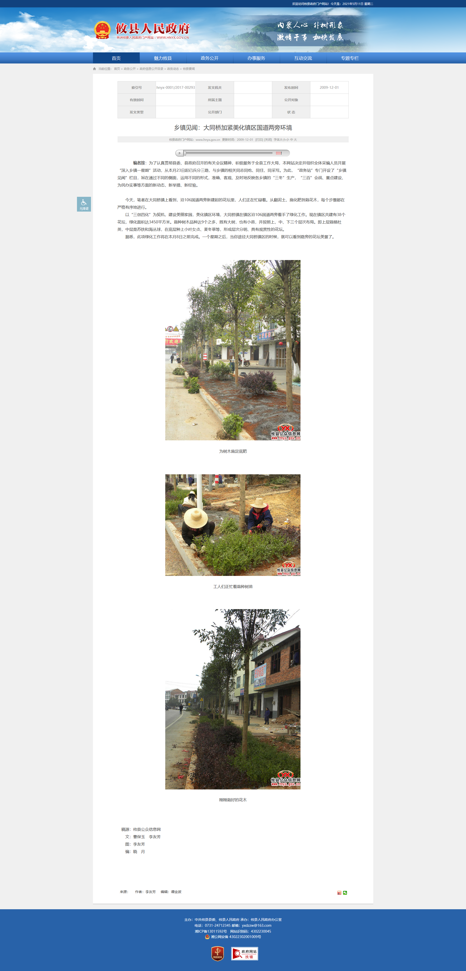 今天,笔者在大同桥镇上看到,沿106国道两旁新建起的花坛里,人们正在忙碌着。从翻泥土、施化肥到栽花木,每个步骤都在严格有序地进行。