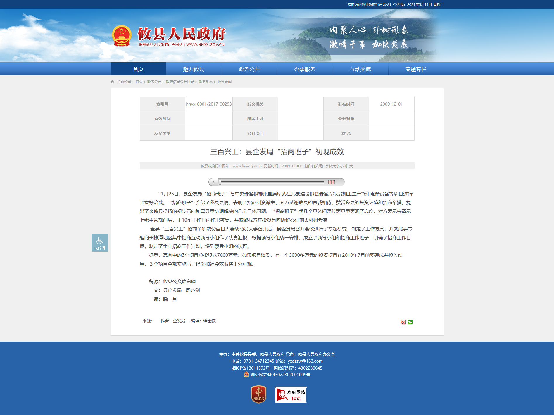 11月25日,县企发局“招商班子”与中央储备粮郴州直属库就在我县建设粮食储备库粮食加工生产线和电器设备等项目进行了友好洽谈。“招商班子”介绍了我县县情,表明了招商引资诚意。对方感谢攸县的真诚相待,赞赏我县的投资环境和招商举措,提出了来攸县投资的初步意向和需县里协调解决的几个具体问题。“招商班子”就几个具体问题代表县里表明了态度,对方表示待请示上级主管部门后,于10个工作日内作出答复,并诚邀我方在投资意向协议签订前去郴州考察。