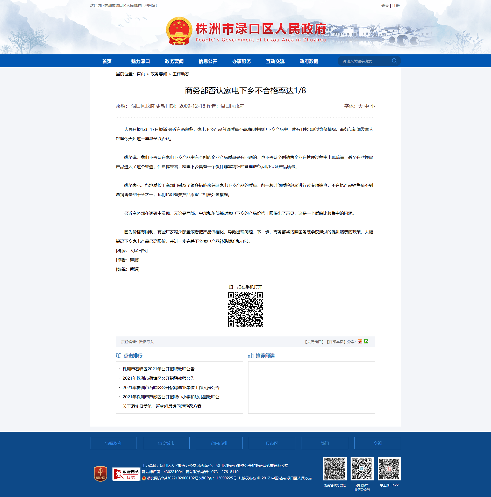 人民日报12月17日报道 最近有消息称,家电下乡产品普遍质量不高,每8件家电下乡产品中,就有1件出现过维修情况。商务部新闻发言人姚坚今天对这一消息予以否认。