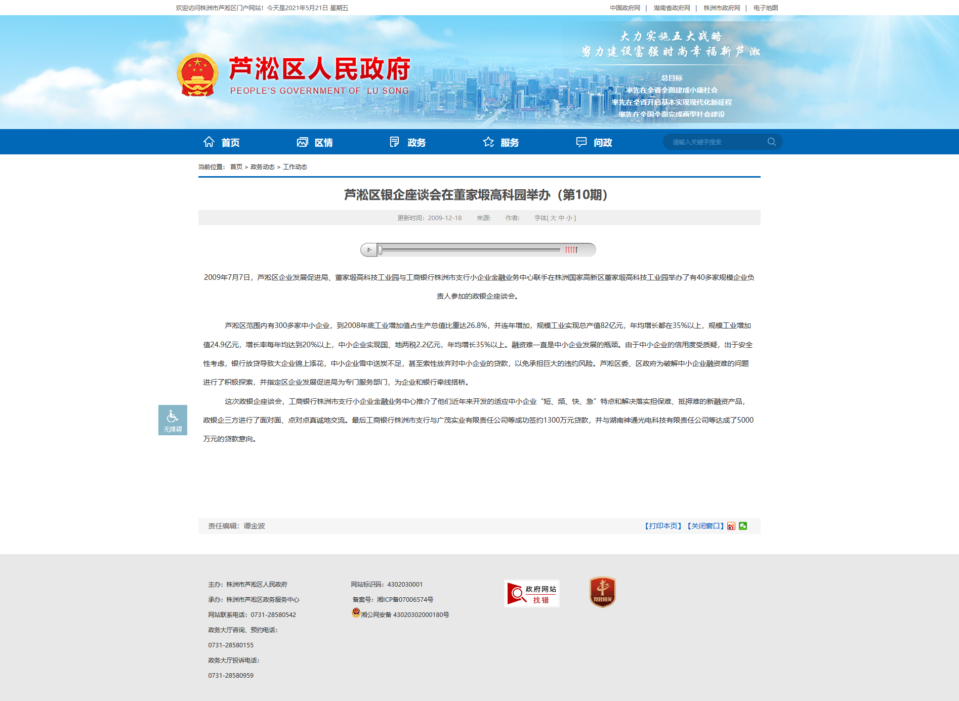 2009年7月7日,芦淞区企业发展促进局、董家塅高科技工业园与工商银行株洲市支行小企业金融业务中心联手在株洲国家高新区董家塅高科技工业园举办了有40多家规模企业负责人参加的政银企座谈会。芦淞区范围内有300多家中小企业,到2008年底工业增加值占生产总值比重达26.8%,并连年增加,规模工业实现总产值82亿元,年均增长都在35%以上,规模工业增加值24.9亿元,增长率每年均达到20%以上,中小企业实现国、地两税2.2亿元,年均增长35%以上。融资难一直是中小企业发展的瓶颈。由于中小企业的信用度受质疑,出于安全性考虑,银行放贷导致大企业锦上添花,中小企业雪中送炭不足,甚至索性放弃对中小企业的贷款,以免承担巨大的违约风险。芦淞区委、区政府为破解中小企业融资难的问题进行了积极探索,并指定区企业发展促进局为专门服务部门,为企业和银行牵线搭桥。这次政银企座谈会,工商银行株洲市支行小企业金融业务中心推介了他们近年来开发的适应中小企业“短、频、快、急”特点和解决落实担保难、抵押难的新融资产品,政银企三方进行了面对面、点对点真诚地交流。最后工商银行株洲市支行与广茂实业有限责任公司等成功签约1300万元贷款,并与湖南神通光电科技有限责任公司等达成了5000万元的贷款意向。