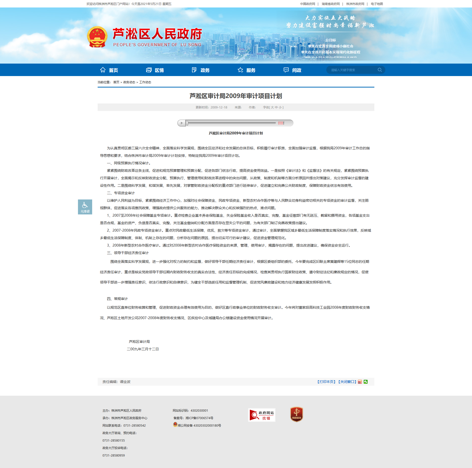 为认真贯彻区委三届六次全会精神,全面落实科学发展观,围绕全区经济和社会发展的总体目标,积极履行审计职责,全面加强审计监督,根据我局2009年审计工作总的指导思想和要求,结合株洲市审计局2009年审计计划安排,特制定我局2009年审计项目计划。一、同级预算执行情况审计。紧紧围绕财政改革这条主线,促进和规范预算管理和预算分配,促进各部门依法行政,提高资金使用效益。一是按照《审计法》和《监督法》的有关规定,紧紧围绕预算执行开展审计,全面揭示和反映财政资金分配、预算执行、管理使用和财政改革进程中的突出问题,从政策、制度和机制等方面分析原因并提出对策建议,充分发挥审计监督的建设性作用。二是围绕科学发展、和谐发展、率先发展,对掌管财政资金分配权的重点部门进行延伸审计,促进建立和完善公共财政制度,保障财政资金依法有效使用。二、专项资金审计以维护人民利益为目标,紧紧围绕经济工作中心,加强对社会保障资金、民政专项资金、新型农村合作医疗等与人民群众切身利益密切相关的专项资金的审计监督,关注弱视群体,促进落实各项惠民政策,增强政府提供公共服务的能力,推动解决群众关心和反映强烈的热点、难点问题。1、2007至2008年社会保障基金专项审计。重点检查企业基本养老保险基金、失业保险基金收入是否真实、完整,基金征缴部门有无延压、截留和挪用资金,各项基金支出是否合规,基金的资产、负债是否真实、完整,关注基金缴纳和分配方面是否存在显失公平的问题,为有关部门制订完善政策提出建议。2、2007-2008年民政专项资金审计。重点对民政最低生活保障、优抚、救灾等专项资金审计,通过审计,全面掌握我区城乡最低生活保障制度落实情况和执行效果,反映城乡最低生活保障制度、体制、机制上存在的问题,分析存在问题的原因,提出切实可行的审计建议,促进资金管理规范化。3、2008年新型农村合作医疗审计。通过对2008年新型农村合作医疗保险资金的来源、管理、使用审计,揭露存在的问题,提出改进建议,确保资金安全运行。三、领导干部经济责任审计围绕全面落实科学发展观,进一步强化对权力的制约和监督,做好领导干部任期经济责任审计,根据区委组织部的委托,今年要完成区妇联主席黄建辉等15位同志的任期经济责任审计,重点是核实党政领导干部任期内财政财务收支的真实合法性、经济责任目标的完成情况,检查其贯彻执行国家财经政策、遵守财经法纪和廉政规定的情况,促使领导干部进一步增强责任意识、依法行政意识和自律意识,为健全干部选拔任用和监督管理机制、促进党风廉政建设和地方经济健康发展发挥积极作用。 四、常规审计以规范区直单位财务核算和管理、促进财政资金合理有效使用为目的,做好区直行政事业单位的财政财务收支审计。今年将对董家段高科技工业园2008年度财政财务收支情况、芦淞区土地开发公司2007-2008年度财务收支情况、区疾控中心及城建局办公楼建设资金使用情况开展审计。 芦淞区审计局 二00九年三月十二日