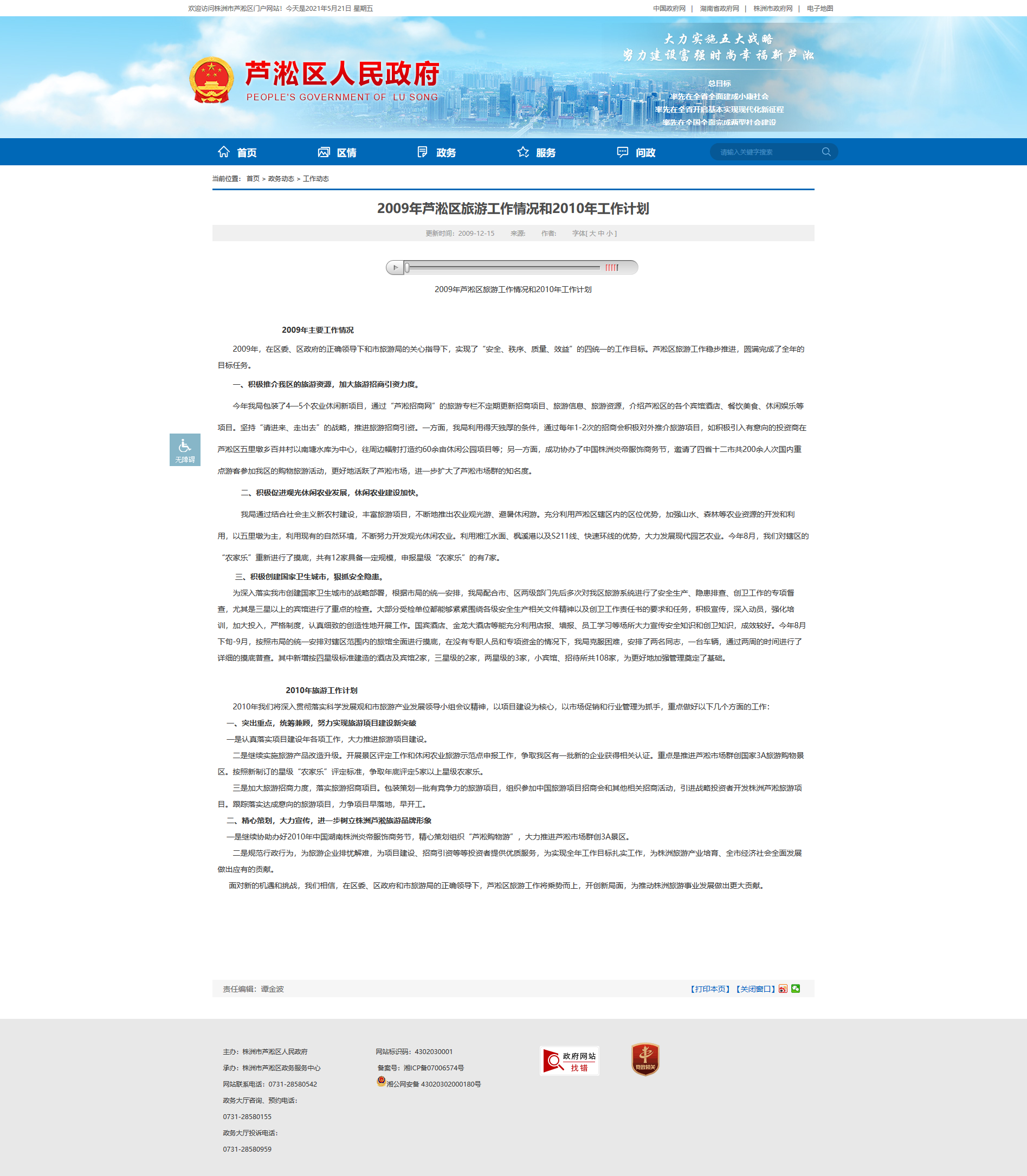 2009年芦淞区旅游工作情况和2010年工作计划
