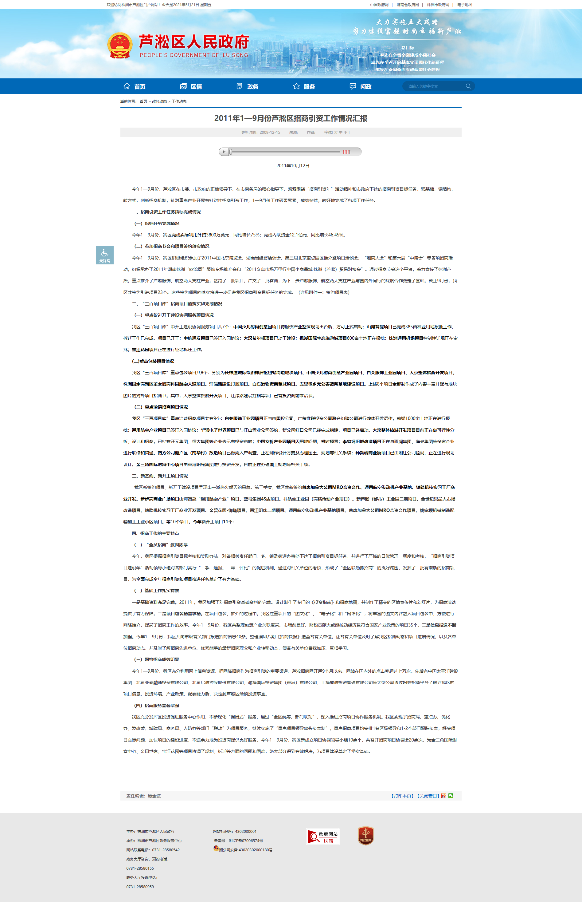 2011年10月12日 今年1—9月份,芦淞区在市委、市政府的正确领导下,在市商务局的精心指导下,紧紧围绕“招商引资年”活动精神和市政府下达的招商引资目标任务,强基础,调结构,转方式,创新招商机制,针对重点产业开展有针对性招商引资工作,1—9月份工作硕果累累、成绩斐然,较好地完成了各项工作任务。
